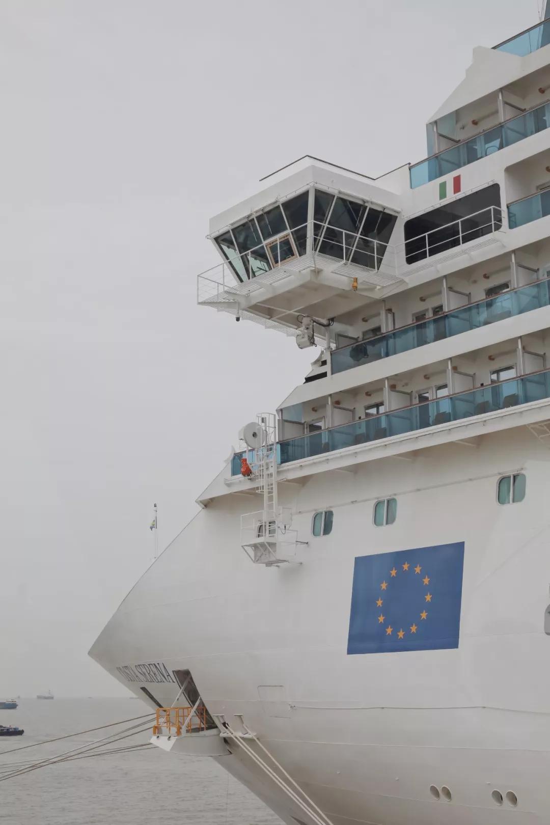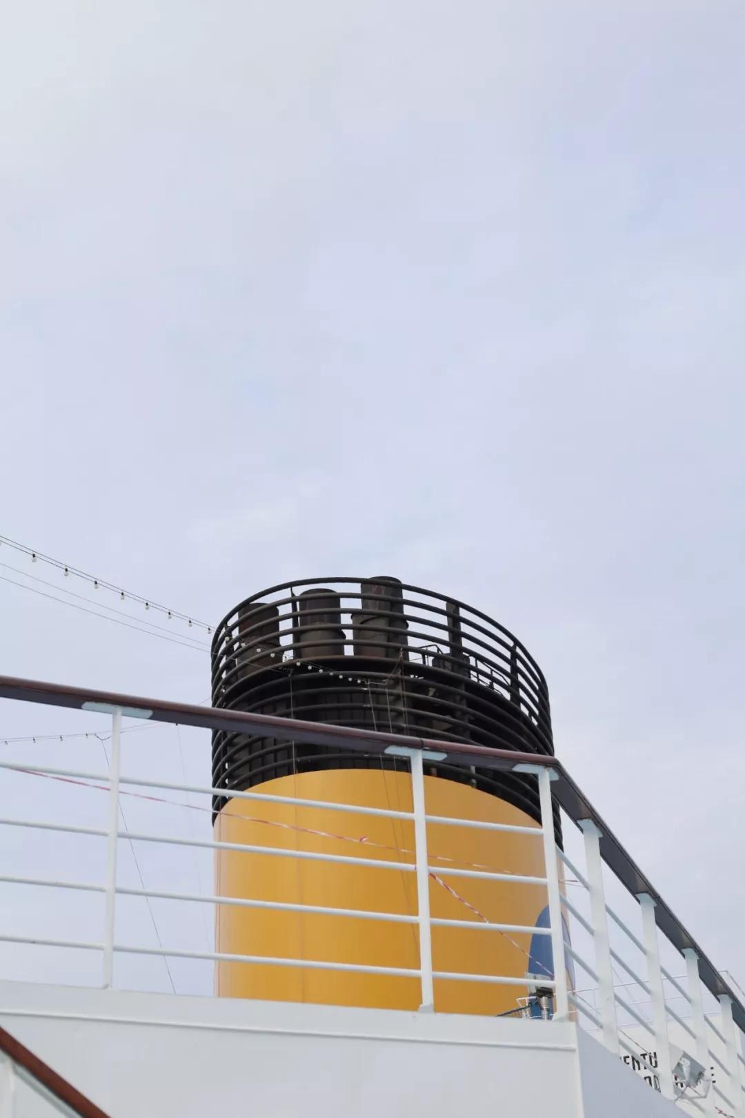 旅程第一天從上海吳淞口碼頭開(kāi)始,賽琳娜號(hào)明黃色的煙囪在晴空下格外矚目。