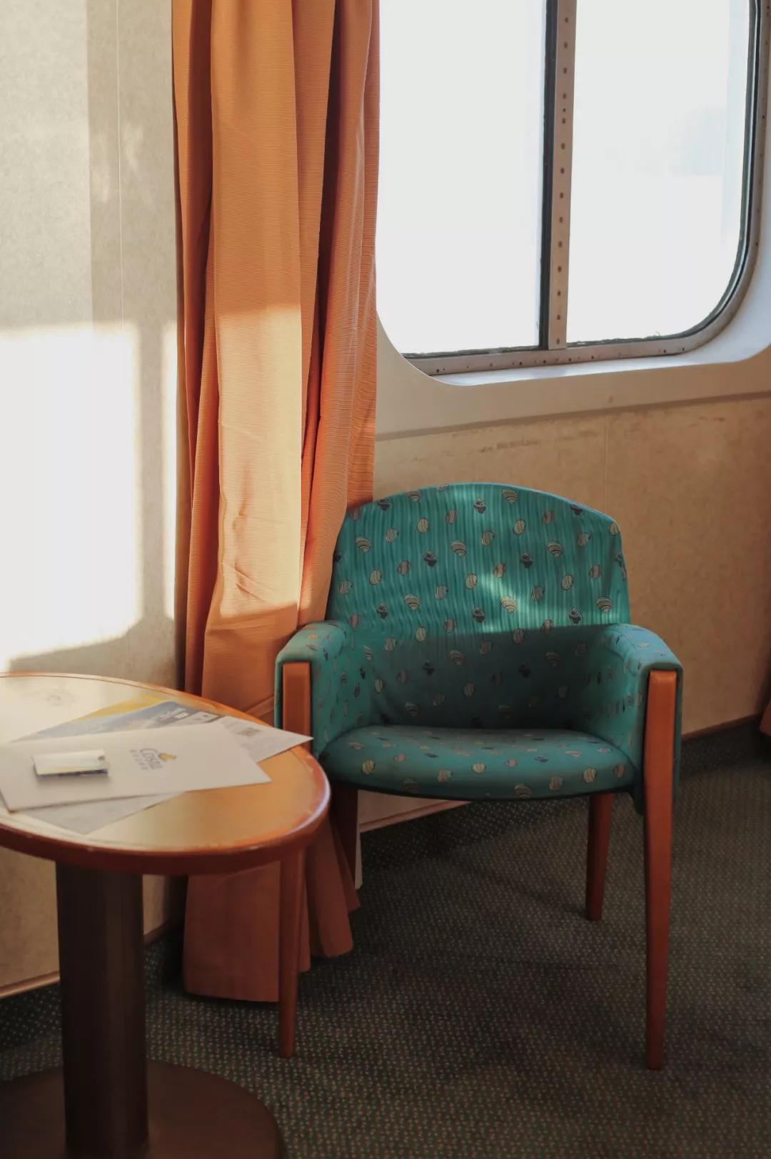 穿越漫長(zhǎng)的走廊通道抵達(dá)房間,墨綠與橘黃的色彩搭配叫人心情明媚,從小巧的懸窗向外望,船只尚未起航,蒼茫的海水寧?kù)o無(wú)波,而之后幾天,緩緩起伏的海浪會(huì)伴隨每一日黎明的惺忪睡眼與深沉的晚安。