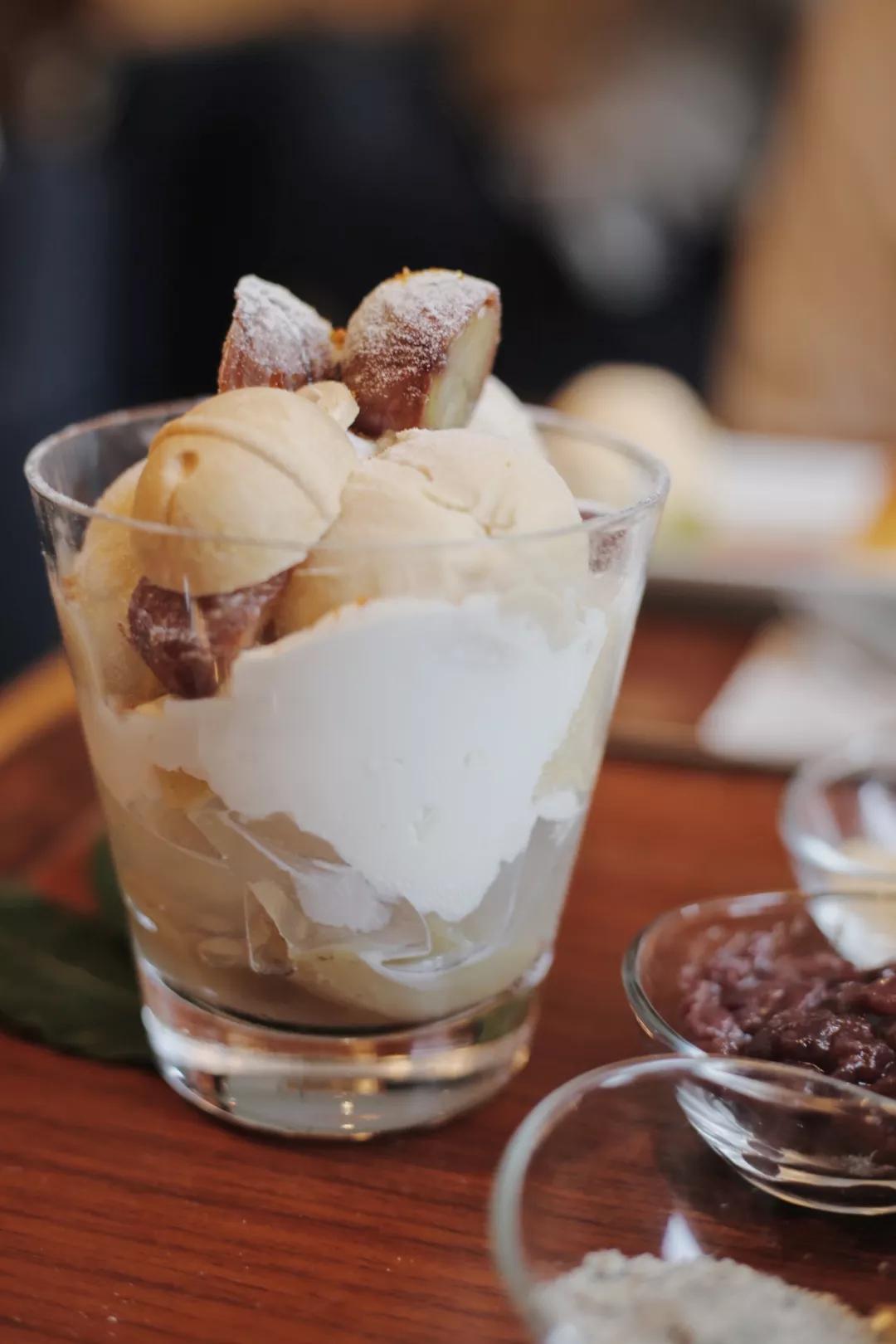 對(duì)甜品毫無(wú)抵抗力的我們當(dāng)然沒(méi)有善罷甘休,又嘗試了布丁與冰淇淋。布丁滑進(jìn)嘴里時(shí)還帶著焦糖的濃郁香氣, 冰淇淋上覆蓋著蒸得軟糯的栗子,每一勺的綜合口感都叫人雀躍。在福岡的第一站,因?yàn)楹贸缘奶瘘c(diǎn),一整天都元?dú)鉂M(mǎn)滿(mǎn)。