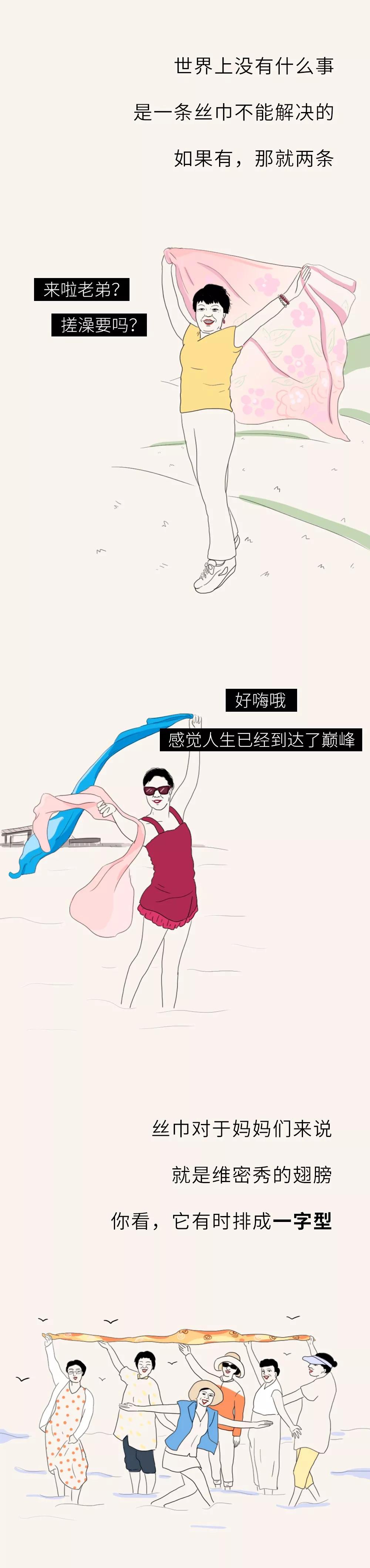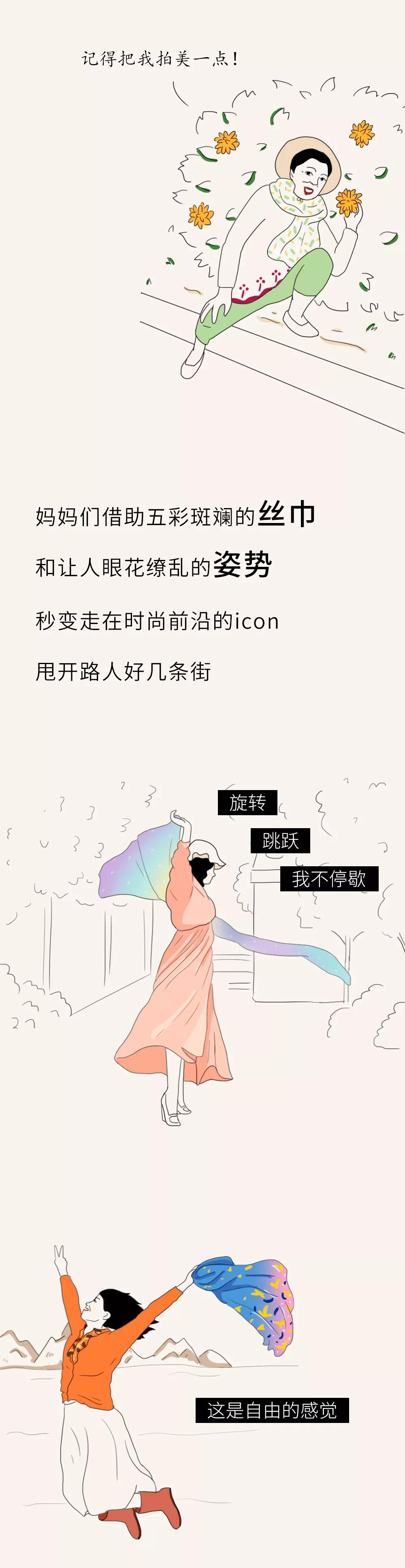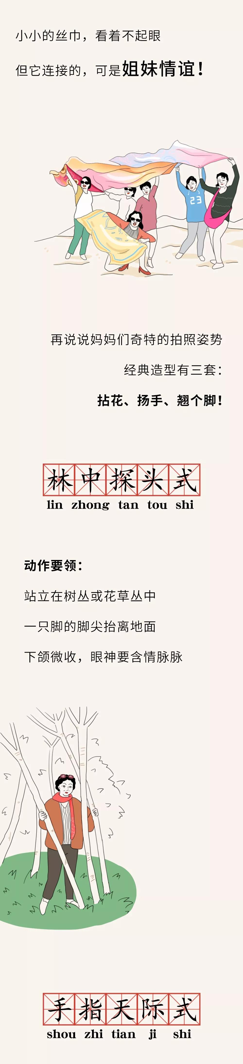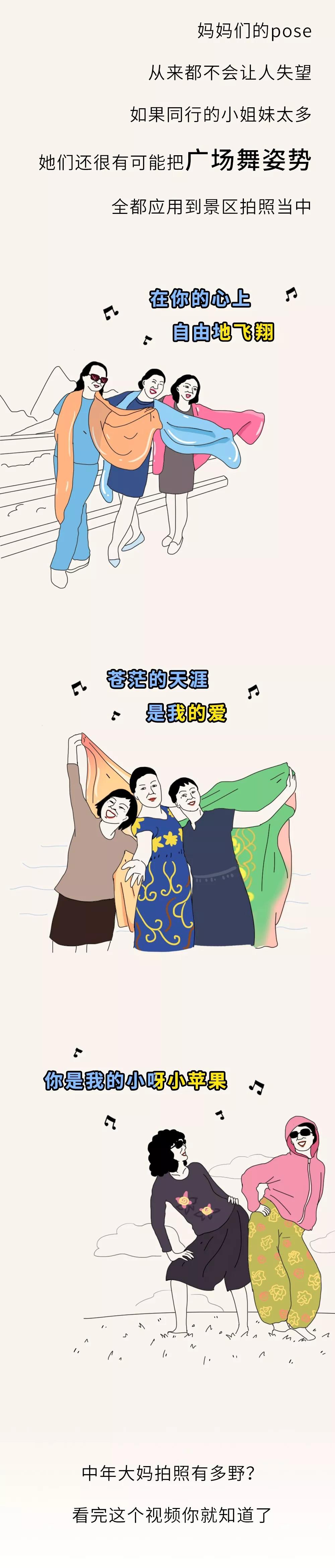 每次一到景區(qū),身披各色絲巾的大媽們,絕對(duì)是一道亮麗的風(fēng)景線:她們紅得像火、粉得像霞、綠得像草、白得像雪、藍(lán)得像天,憑自己的實(shí)力向你證明:什么才叫五彩斑斕。她們的人生信條就是:頭可斷,血可流,絲巾不能丟。絲巾舉過頭頂?shù)哪且凰查g,感覺自己就是Super star。對(duì)于她們來說,萬物皆可盤拍:除了景區(qū)的標(biāo)志性建筑、各種帶字的標(biāo)牌、花草樹木,還有石獅子、雕像、欄桿等等,甚至連路邊發(fā)傳單的玩偶也不放過……