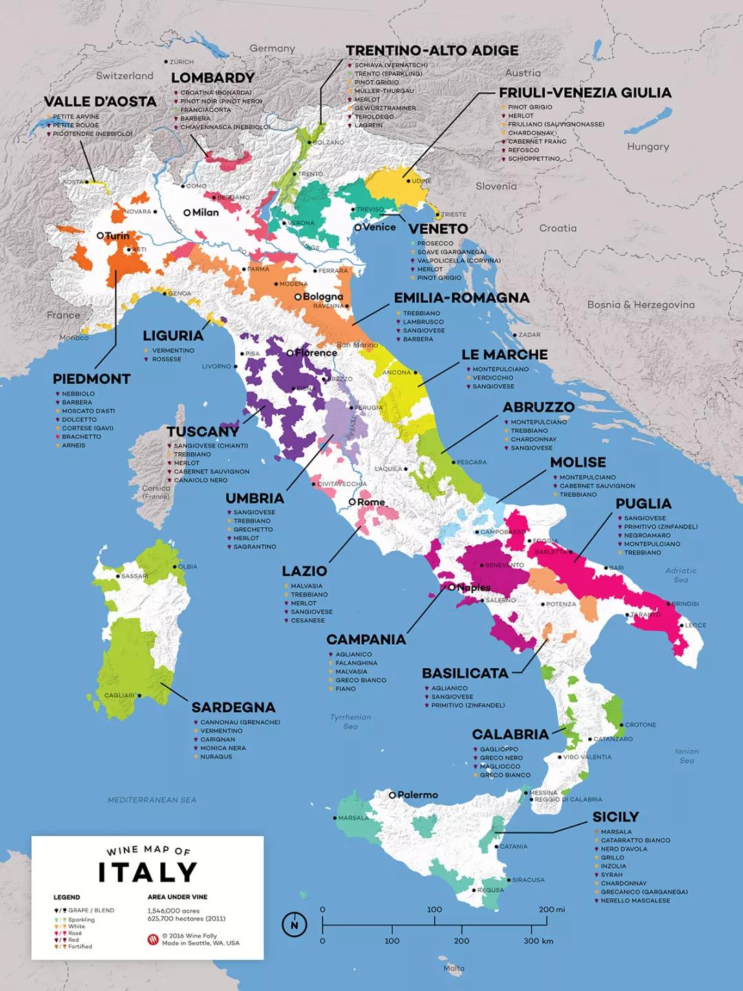 現(xiàn)時(shí)(2019年2月),意大利全國(guó)一共有74個(gè)DOCG產(chǎn)區(qū)。