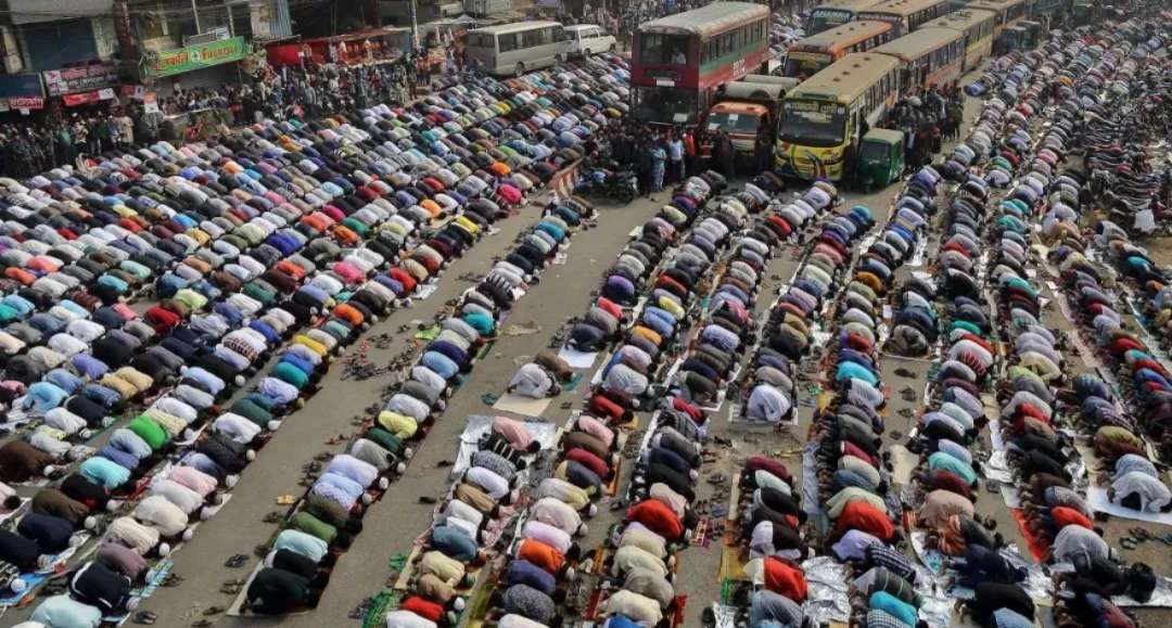 在伊教“全球盛會(huì)”期間,人們?cè)诿霞永瓏?guó)的達(dá)卡街道上祈禱?!叭蚴?huì)”(Bishwa Ijtema) 是每年在達(dá)卡舉行的主要宗教聚會(huì)之一,聚集了數(shù)百萬信徒參加。專用的祈禱場(chǎng)地已經(jīng)不足以容納這么多人,所以很多人來到達(dá)卡的主要街道祈禱。在此期間,所有地面交通和行人都將暫停等待儀式結(jié)束。