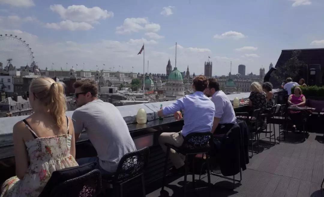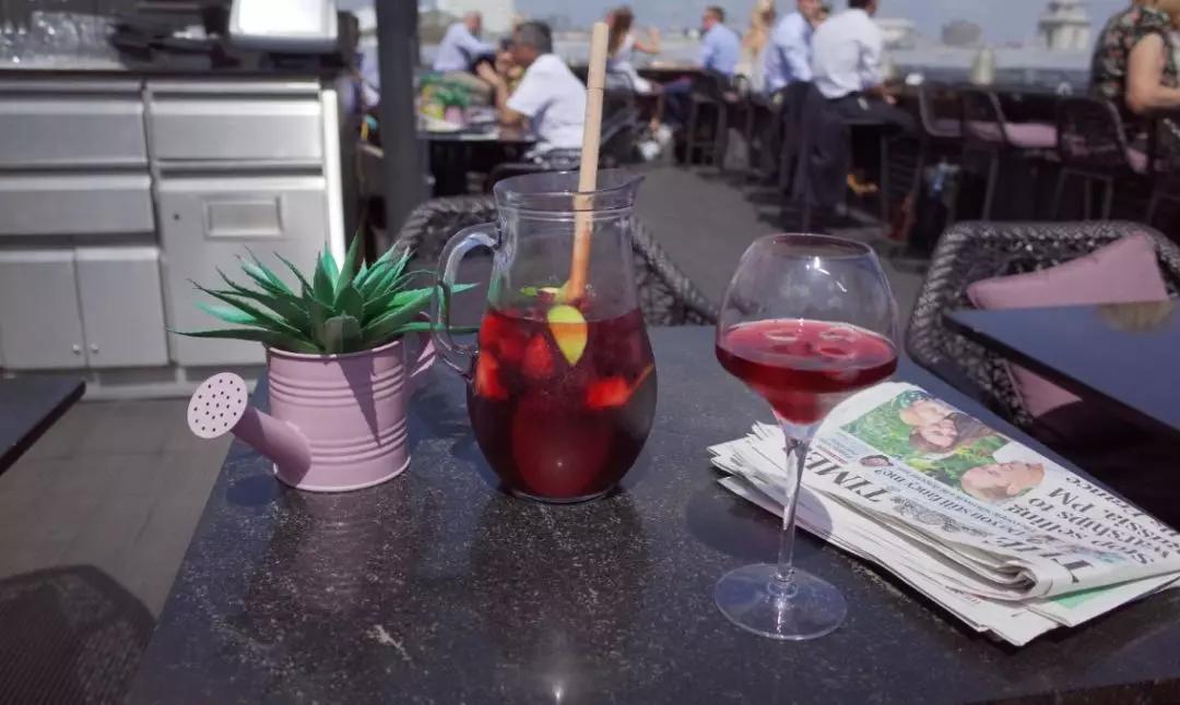 這家酒吧屬于Trafalgar Hotel 內(nèi)部的屋頂酒吧,最有名的點是因為他就在特拉法加廣場(Trafalgar Square) 正旁邊,所以邊喝酒可以邊看著廣場的車水馬龍與人們,另一面則看得倫敦眼。這間屋頂酒吧只有在春夏季節(jié)時才啟用,入場也是從飯店大聽坐電梯上樓,常常到下午會人潮爆滿的情況,而且四點后會收入場費£5,自己要抓一下時間。之前跟哥們來常常會點一壺Sangria 喝酒聊天曬太陽,非常愜意。