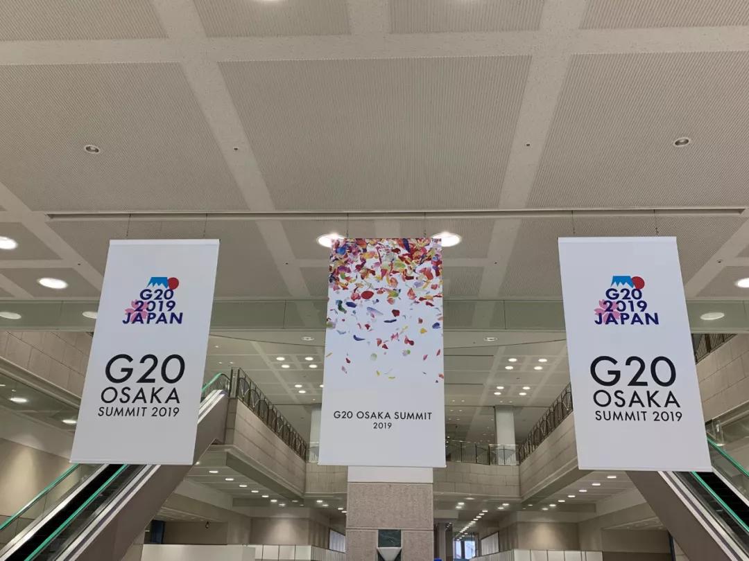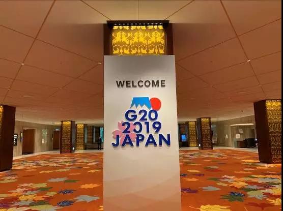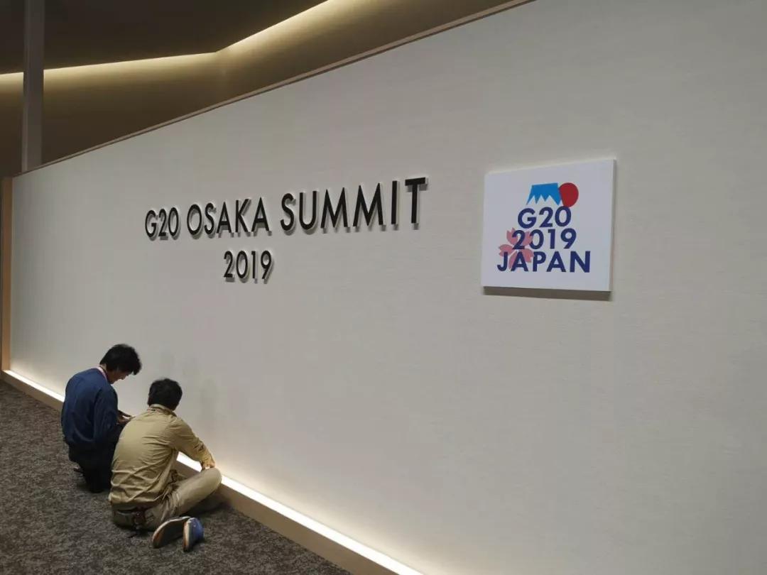 大阪麗嘉皇家酒店內(nèi),帶有二十國集團(tuán)領(lǐng)導(dǎo)人大阪峰會(huì)會(huì)標(biāo)的迎賓牌格外醒目。