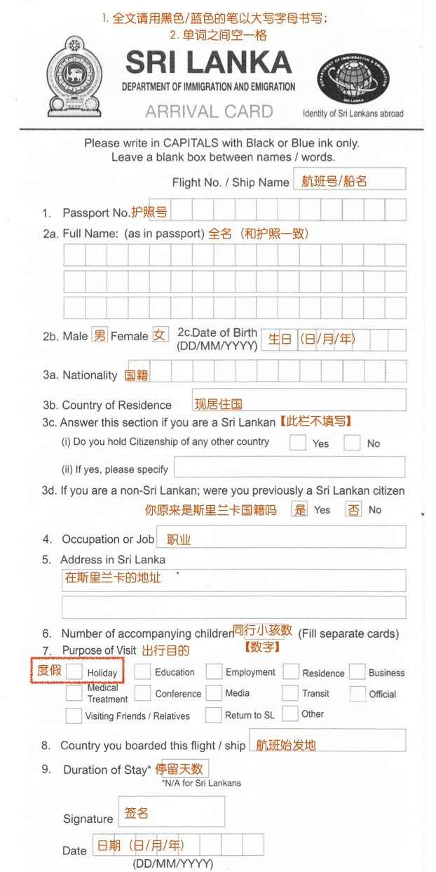 國際游客在進入斯里蘭卡都需要填寫入境卡(12歲以下算同行兒童,兒童人數(shù)需要填寫在成人的入境卡上)。乘客可以在飛機上向空乘人員領取,填好表格后在過海關時交給工作人員就好。