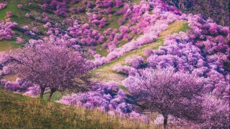 4月初,這里就變身杏花海洋,每個山巒都點(diǎn)綴著開滿了花朵的野樹林。