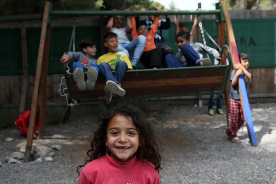 2018 年4 月12日,在希臘雅典以北約 86 公里處的里措納難民營,兒童在秋千上玩耍。歐盟委員會主管移民、內部事務與公民事務的委員阿夫拉莫普洛斯 12 日在視察雅典附近一座難民營時表示,歐盟將繼續(xù)幫助希臘、意大利等處于難民問題前沿的國家。