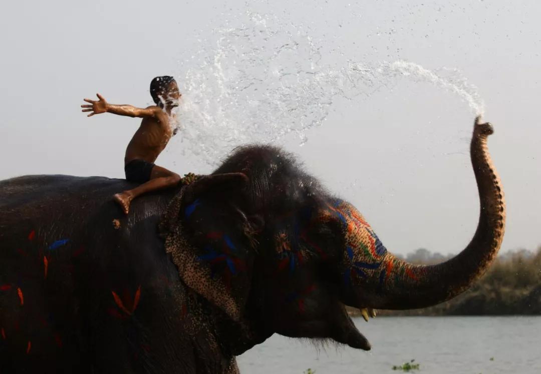 2018 年12月27日,在尼泊爾奇特旺,一名兒童在大象節(jié)上和大象戲水。第十五屆尼泊爾大象節(jié)正在奇特旺的索拉哈鎮(zhèn)舉行,活動旨在推廣當地旅游業(yè)并增強人們對野生動物的保護意識。