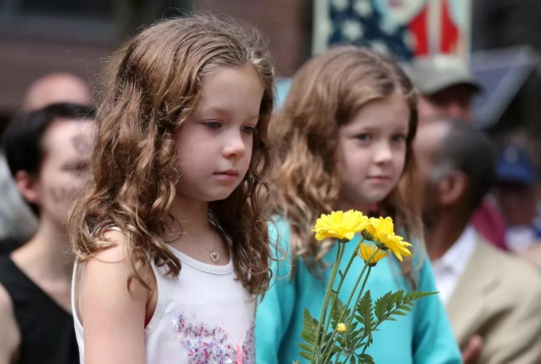 2017 年8月13日,在美國芝加哥,一名小女孩手持鮮花參加紀念活動。數百名芝加哥市民13日聚集在市中心的聯(lián)邦廣場,為美國弗吉尼亞州夏洛茨維爾市暴力事件受害者舉行紀念活動。