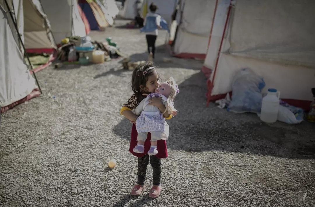 2017 年11月15日,在伊朗克爾曼沙阿省的薩爾波勒扎哈卜,一個小女孩在帳篷外抱著玩具娃娃。據伊朗媒體15 日報道,伊拉克與伊朗邊境地區(qū) 12 日晚發(fā)生的強烈地震已在伊朗震區(qū)造成 474 人死亡,另有 9388 人受傷。