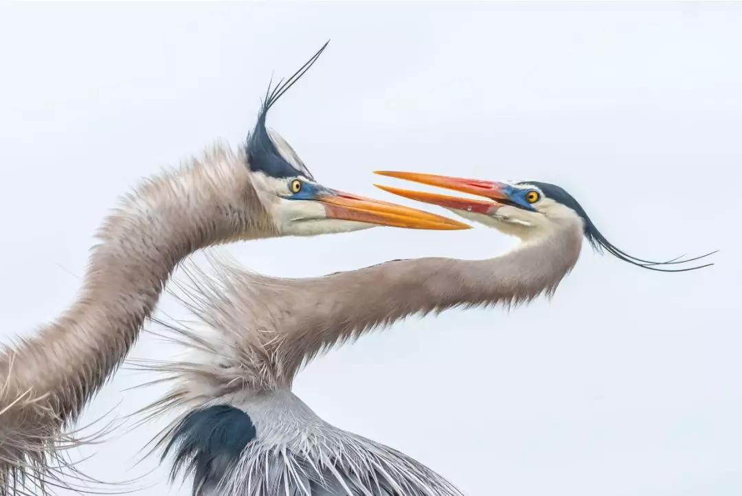照片背后的故事:“在我抵達(dá)我最喜歡的濕地時(shí),一場(chǎng)暴風(fēng)雨在這群大藍(lán)鷺中正蓄勢(shì)待發(fā)。這個(gè)場(chǎng)景一下子抓住了我的注意力:一只雄性大藍(lán)鷺,明顯想要引誘雌性大藍(lán)鷺,正在雌性面前伸展自己的身體。