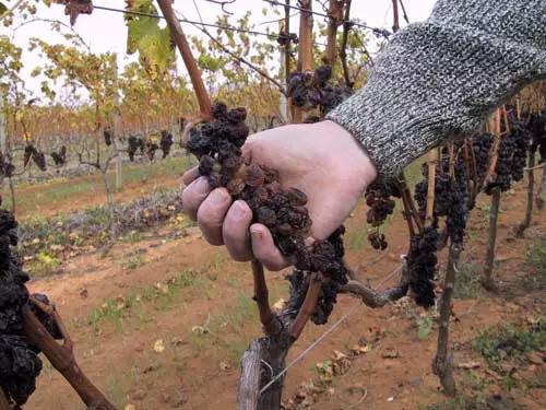 你以為這些真菌會轉(zhuǎn)化成貴腐菌嘛,too young!只有氣候極其合適的時候這些真菌才會發(fā)展成貴腐菌,大部分時候它們只配叫灰霉,能做的所有事情就是搞爛你的葡萄。趕上秋雨連綿的時候,大規(guī)模爆發(fā)的真菌侵染簡直是“車禍現(xiàn)場”。