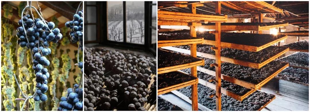 Appassimento,中文譯名枯藤法,是在采收后把成熟健康的葡萄放入風(fēng)干房,采用Ploto*、 Arele*、Uva Appesa*等方式松散的放置,風(fēng)干時間大致在90-120天。
