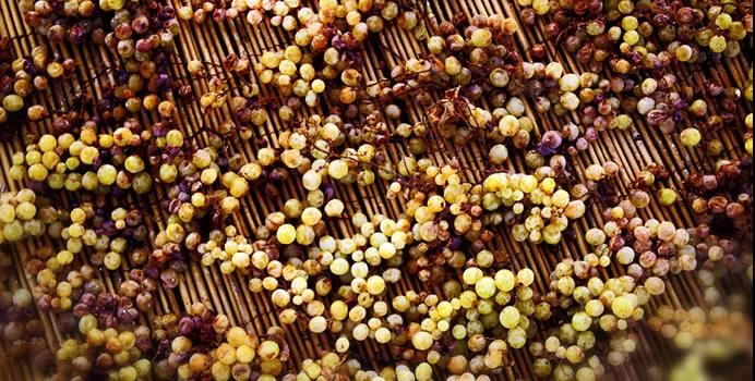 和意大利圣酒在室內(nèi)慢慢脫水?dāng)?shù)月不同,這里的葡萄直接被置于陽光下晾曬12-14天,脫水后進行破碎壓榨,糖分、酸度風(fēng)味物質(zhì)都極為濃縮。