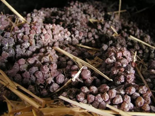 風(fēng)干后壓榨通常在1月進行,出汁率極低(100公斤只能出20升葡萄汁)。