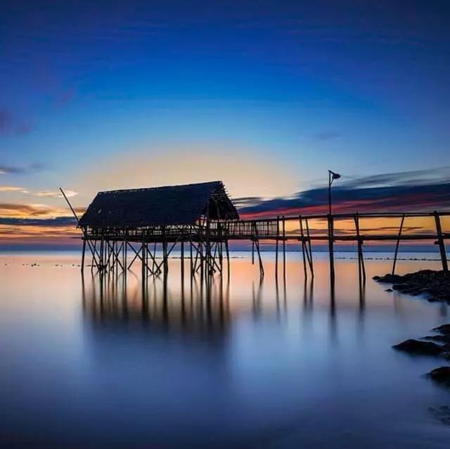 將水平線、地平線放在畫面的正中間,這種構(gòu)圖方式在風(fēng)光攝影中雖然不常見,但也會使用。比如,攝影師想要突出位于湖面上的小亭子,而小亭子又正好擁有一段很長的長廊。我們就可以將這段長廊作為一條水平線來構(gòu)圖。