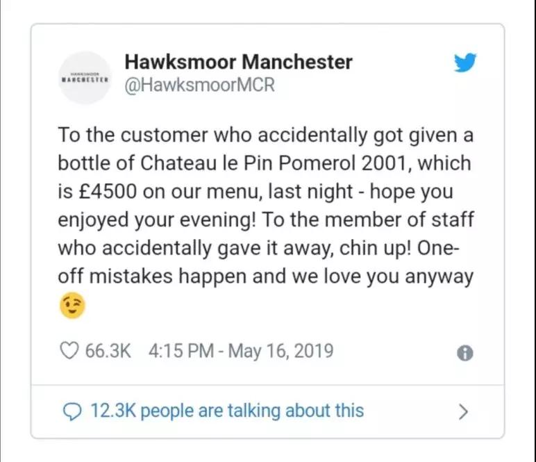 “昨晚意外喝了我們名莊酒的顧客,希望那瓶4500英鎊的2001年里鵬酒莊葡萄酒讓您度過了一個(gè)愉快的夜晚!不小心拿錯酒的那位服務(wù)員,振作起來!人生難免犯次錯,我們依然愛你喲。”