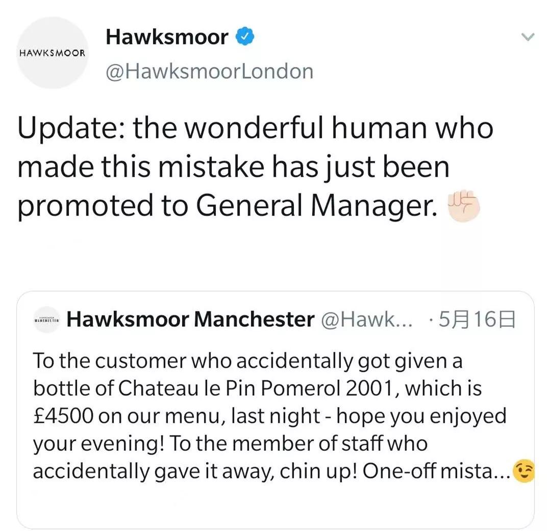更勁爆的是,時(shí)隔近四個(gè)月,霍克斯莫爾曼徹斯特分店昨天又在推特上公布:“最新爆料:犯下這個(gè)錯誤的奇人剛剛被提拔為總經(jīng)理。”