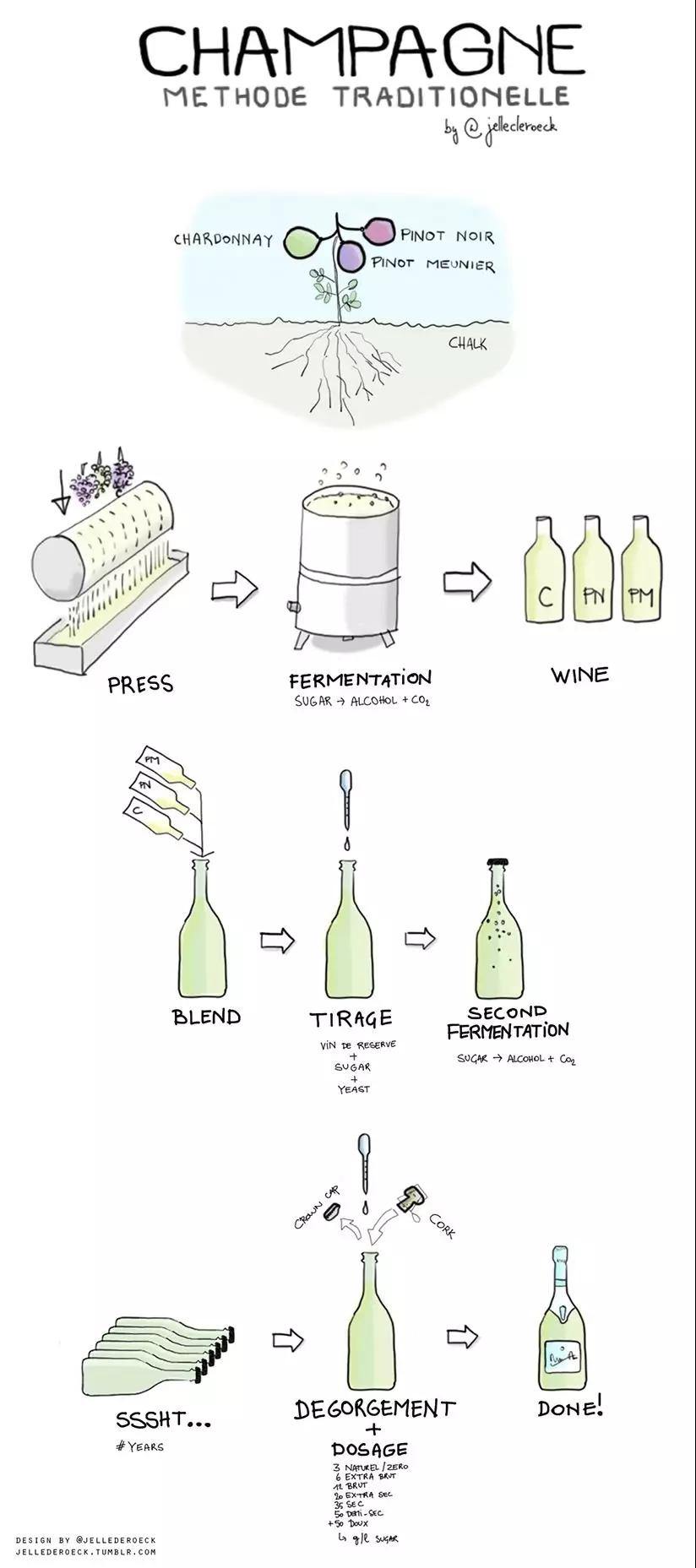 不同于靜止葡萄酒的一步到位,不管是使用傳統(tǒng)法轉(zhuǎn)移法或是罐中發(fā)酵法,起泡酒(包括香檳、Cava、Prosecco等一系列非人工加氣起泡酒)的釀造都需要經(jīng)歷一個二次發(fā)酵的過程。