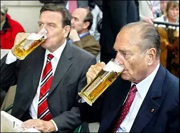 ▲ 法國(guó)前總統(tǒng)希拉克與德國(guó)前總理施羅德喝啤酒
