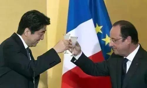 ▲ 在2014年的一場(chǎng)宣傳日本料理的活動(dòng)上,日本首相安倍晉三和法國(guó)前總統(tǒng)奧朗德品嘗日本清酒
