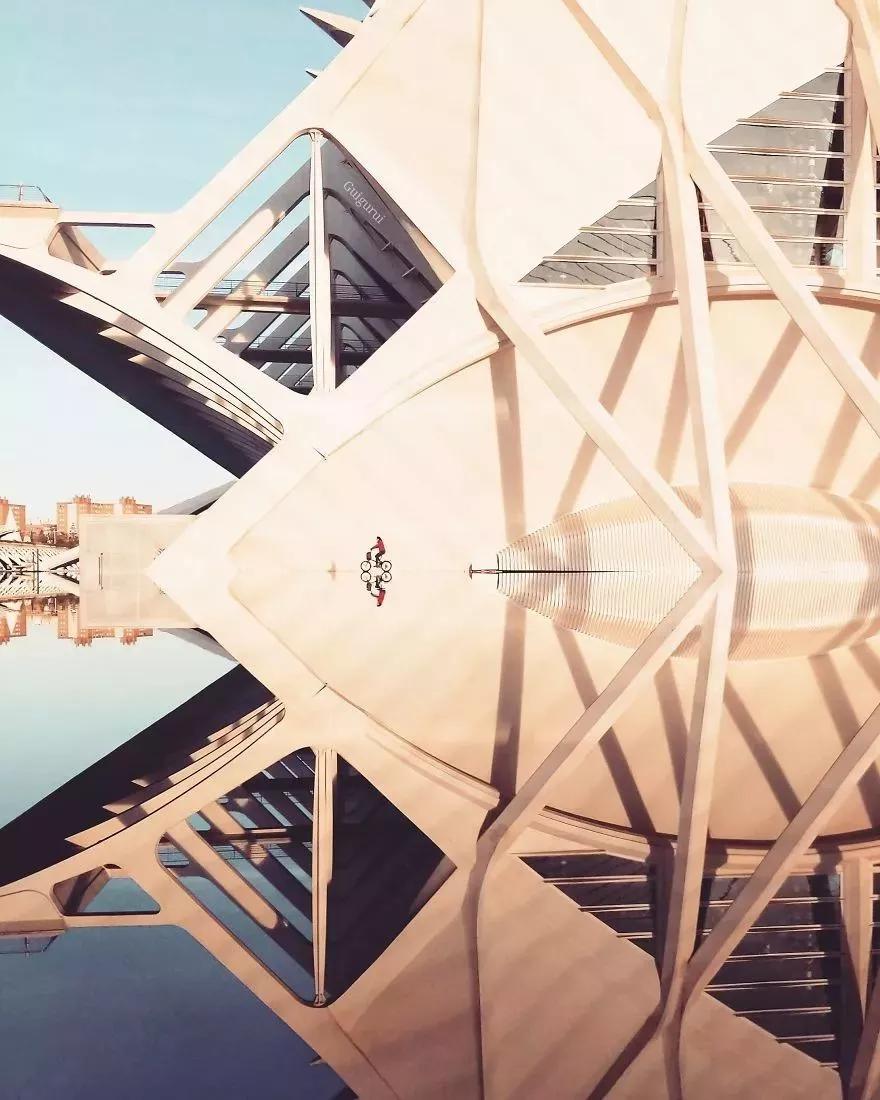 他將同一角度拍攝的航拍照片與普通的照片上下合并,創(chuàng)造出了類似于平行宇宙的效果。