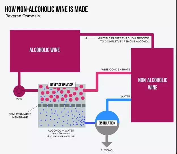 反滲透法(這與海水淡化的原理是一樣的),也叫超過濾法,其利用只允許溶劑透過、不允許溶質(zhì)透過的半透膜,先葡萄酒中的芳香化合物和酚類物質(zhì)與酒精和水分開,再通過蒸餾來將酒精和水分離。由于半透膜的成本高,所以這種方法比較昂貴。