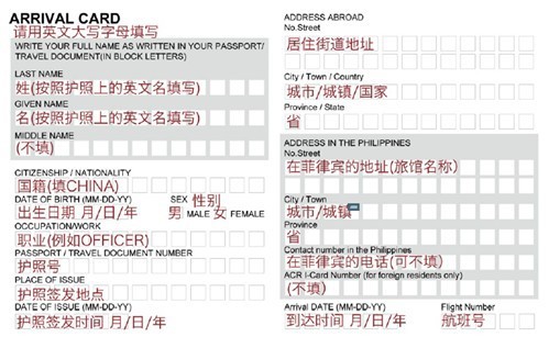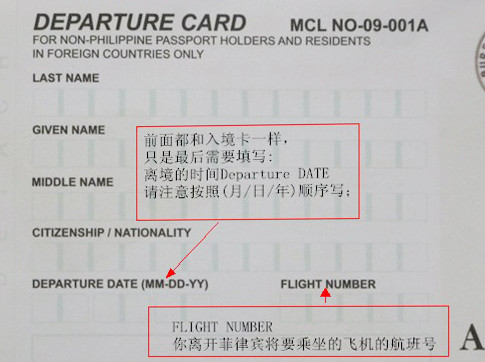 中國(guó)公民在結(jié)束菲律賓觀光旅游,于機(jī)場(chǎng)辦理出境登機(jī)手續(xù)前,應(yīng)先交納機(jī)場(chǎng)稅,然后到訂購(gòu)返機(jī)票的航空公司柜臺(tái)前辦理出境登機(jī)手續(xù),領(lǐng)取登機(jī)卡和行李卡,同時(shí)向航空公司工作人員遞交出境卡。出境卡的填寫內(nèi)容同入境卡基本相同。
