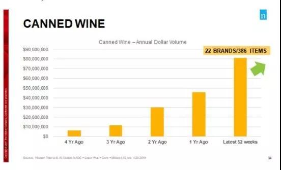 易拉罐葡萄酒的銷量也是火箭般地往上漲,尼爾森數(shù)據(jù)顯示,截至2019年6月15日的52周內(nèi),罐裝葡萄酒在場外渠道的銷售額為7千萬美元,去年增長了69%,而在2012年,易拉罐葡萄酒的年銷售額只有2百萬美元。
