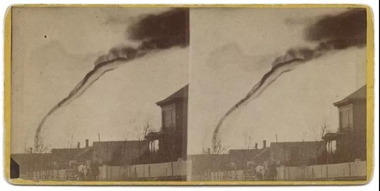目前最早可知的龍卷風(fēng)照片是在美國(guó)堪薩斯州拍到的。1884 年4 月26 日,一陣龍卷風(fēng)緩慢地刮過(guò)堪薩斯州的安德森縣,這給了業(yè)余攝影師A.A. 亞當(dāng)斯(A.A. Adams)設(shè)置他箱式相機(jī)的機(jī)會(huì)和時(shí)間。