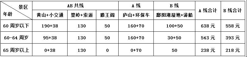 6、門票:根據(jù)各地景區(qū)、景點(diǎn)對(duì)不同年齡段老年游客的優(yōu)惠政策,我們把各景區(qū)不同年齡段的收費(fèi)標(biāo)準(zhǔn)列表如下,請(qǐng)各位老年朋友統(tǒng)一在專列上憑借本人身份證上的實(shí)際年齡把對(duì)應(yīng)的門票費(fèi)用交給全陪導(dǎo)游,年齡核對(duì)至出生年月日。旅游途中如因身體原因或其他特殊情況,沒(méi)有參觀的景點(diǎn)門票或景區(qū)小交通費(fèi)用在返程專列上由全陪退還。各位游客也可根據(jù)當(dāng)時(shí)當(dāng)?shù)氐捏w力情況自由選擇購(gòu)票。(以下景點(diǎn)門票價(jià)格供參考,如遇景區(qū)政策性調(diào)價(jià),則以景區(qū)實(shí)際門票政策為準(zhǔn),贈(zèng)送項(xiàng)目不去無(wú)費(fèi)用退還):
