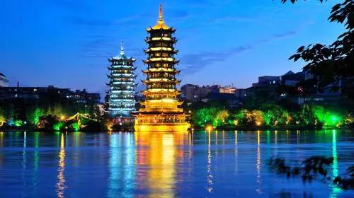 游覽新地標(biāo)【日月雙塔】(登塔約40分鐘),座落在桂林城的中軸線上,與象山上的普賢塔、塔山上的壽佛塔,相互呼應(yīng),相互映襯,有“四塔同美”之說(shuō),是兩江四湖環(huán)城水系中最著名的旅游景點(diǎn);
