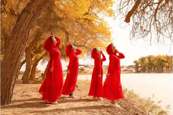 4、穿戴合適的服飾:衣飾最好選擇純色為主(紅色、白色等),以紗質(zhì)/絲質(zhì)披巾為主,突出人物色彩。今天大家可以穿一些紅色、藍色、白色的衣物,搭配胡楊林的漫天黃葉,十分漂亮。
