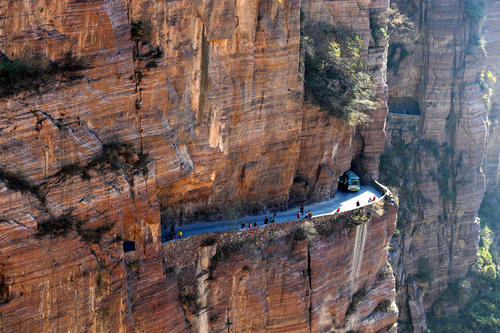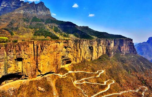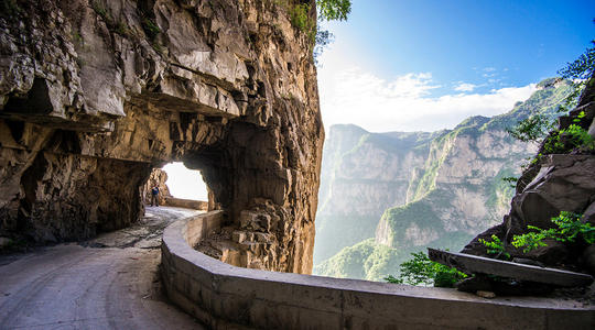 太行山大峽谷中共有六條掛壁公路,其中數(shù)郭亮村到王莽嶺的“昆山隧道"最為壯觀(guān)(郭亮村到王莽嶺最近的一條路),歷經(jīng)30年,人工開(kāi)鑿了一條由山西陵川王莽嶺通往河南輝縣郭亮的掛壁公路。