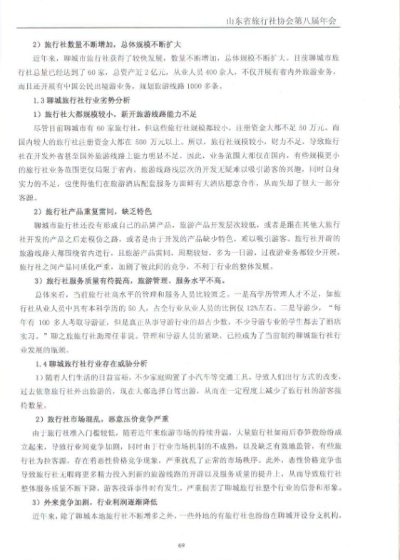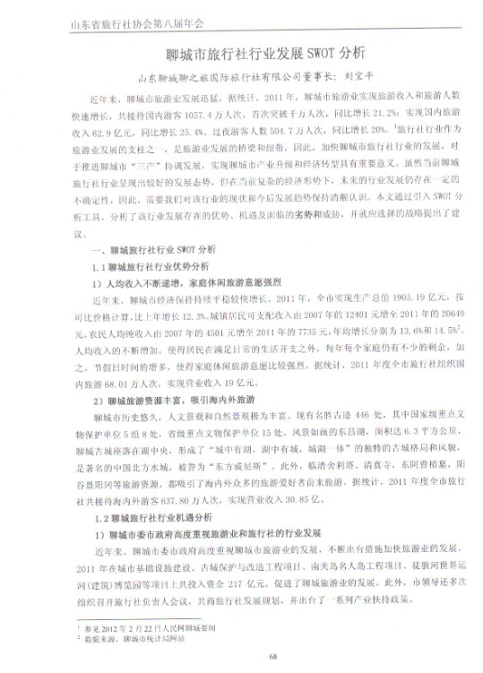 【網(wǎng)宣部】山東省旅行社協(xié)會2012年12月特刊發(fā)表全國優(yōu)秀導游員/聊之旅國際旅行社董事長劉寶平文章《聊城市旅行社行業(yè)發(fā)展SWOT分析》,文章指出雖然當前聊城旅行社行業(yè)呈現(xiàn)出較好的發(fā)展態(tài)勢,但在當前復雜的經濟形勢下,未來的行業(yè)發(fā)展仍存在一定的不確定性,因此,需要我們對該行業(yè)的現(xiàn)狀和今后發(fā)展趨勢保持清醒認識,文章通過引入SWOT分析工具,分析了該行業(yè)發(fā)展存在的優(yōu)勢、機遇及面臨的劣勢和威脅,并就應選擇的戰(zhàn)略提出了建議。