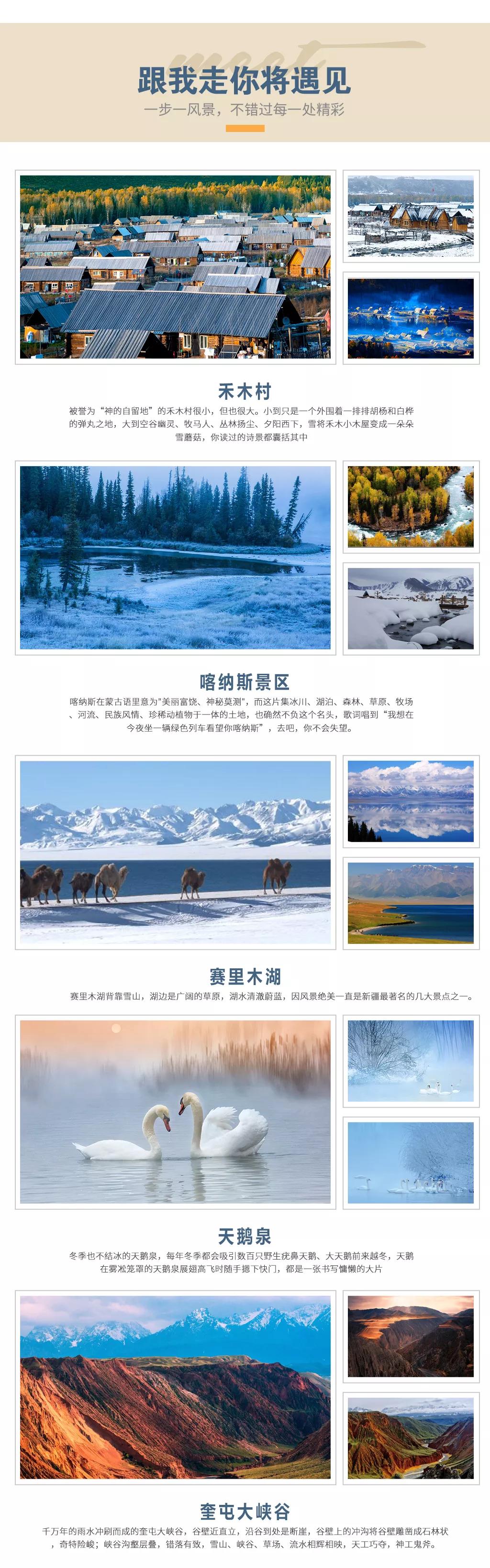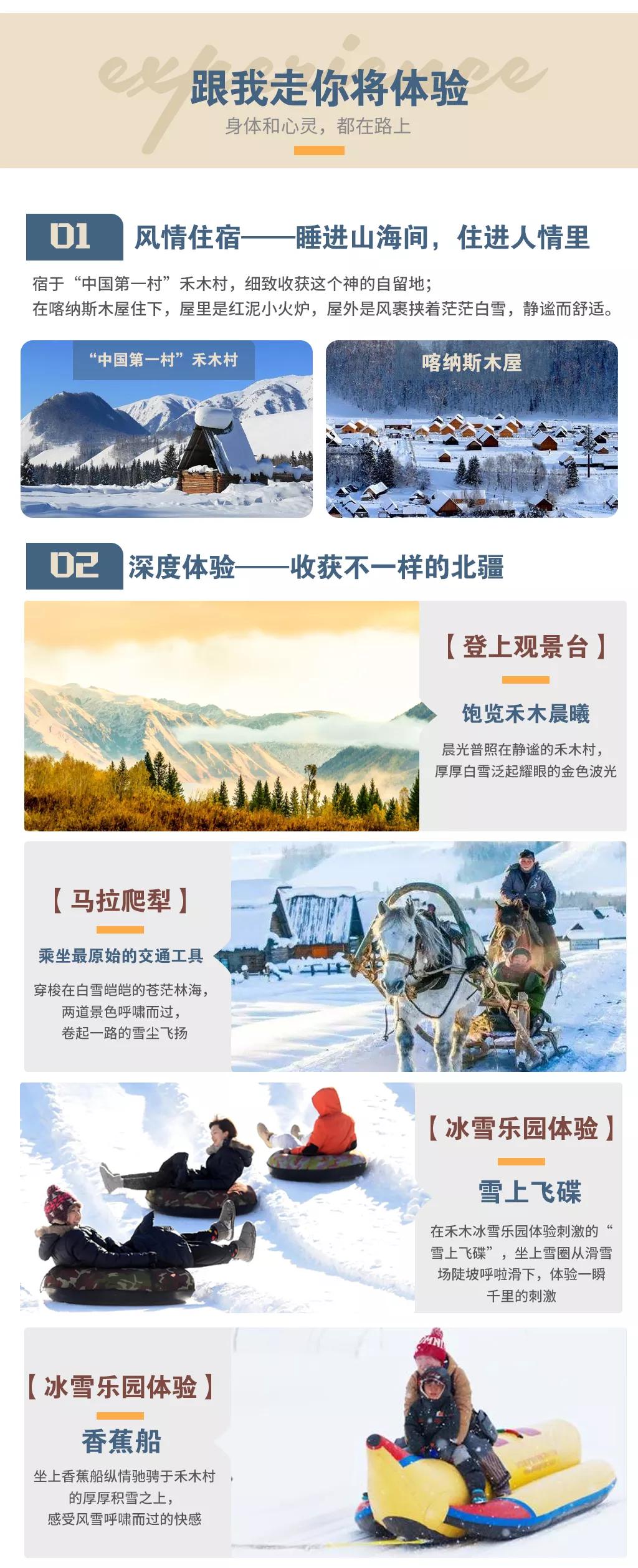4、景區(qū)及小交通:費(fèi)用包含門票以外的其它門票及小交通、娛樂項(xiàng)目需要游客自費(fèi),禾木冰雪樂園其它項(xiàng)目如單人雪地摩托、滑雪板、沖鋒舟、跳雪、雪地摩托車租憑等;