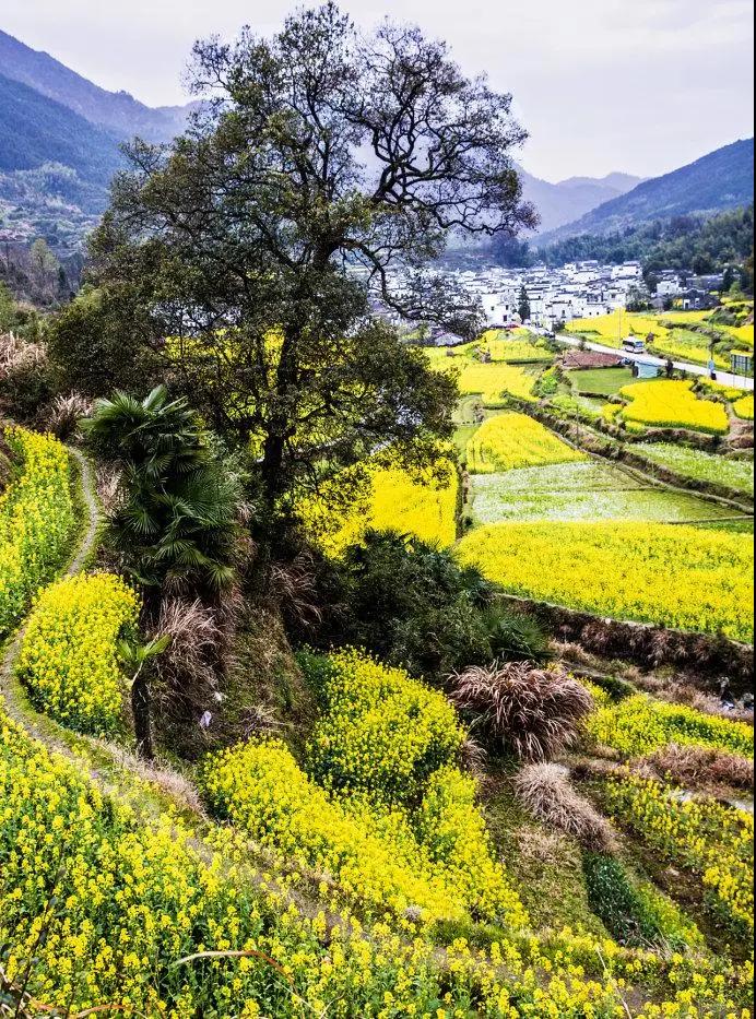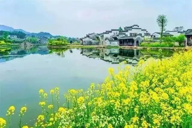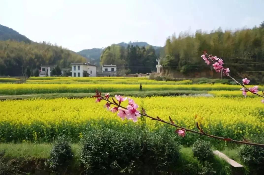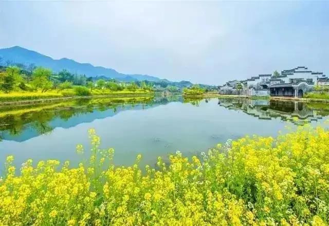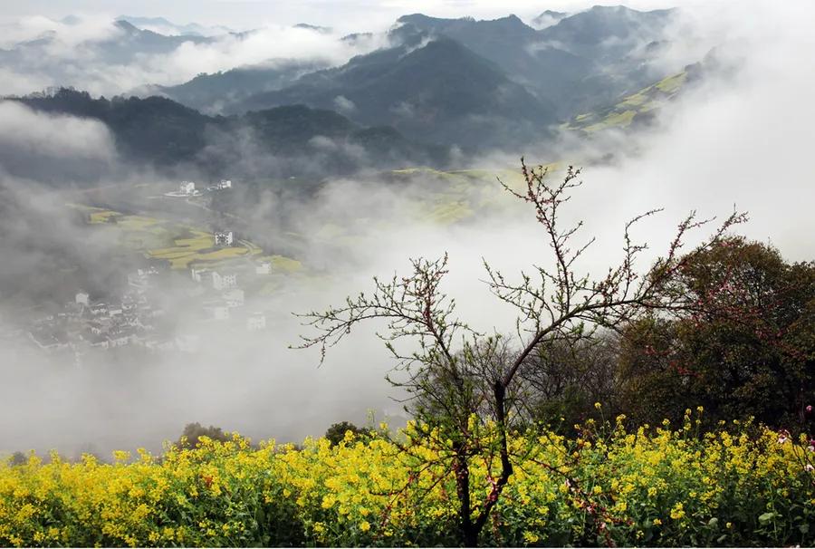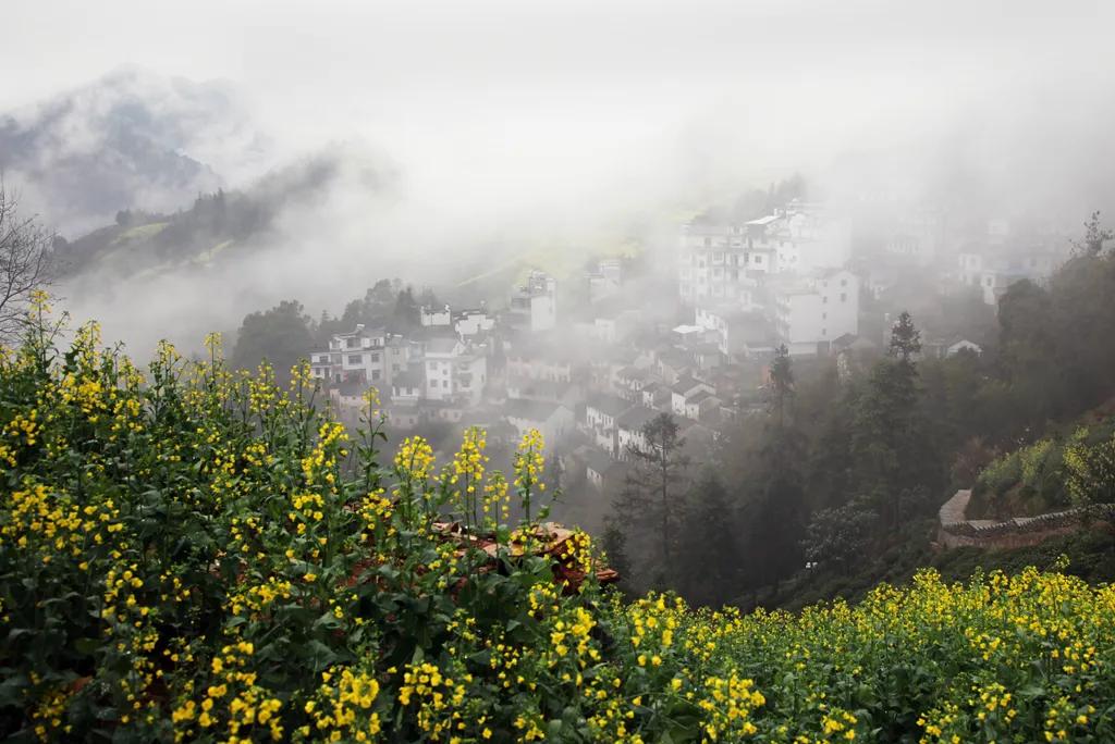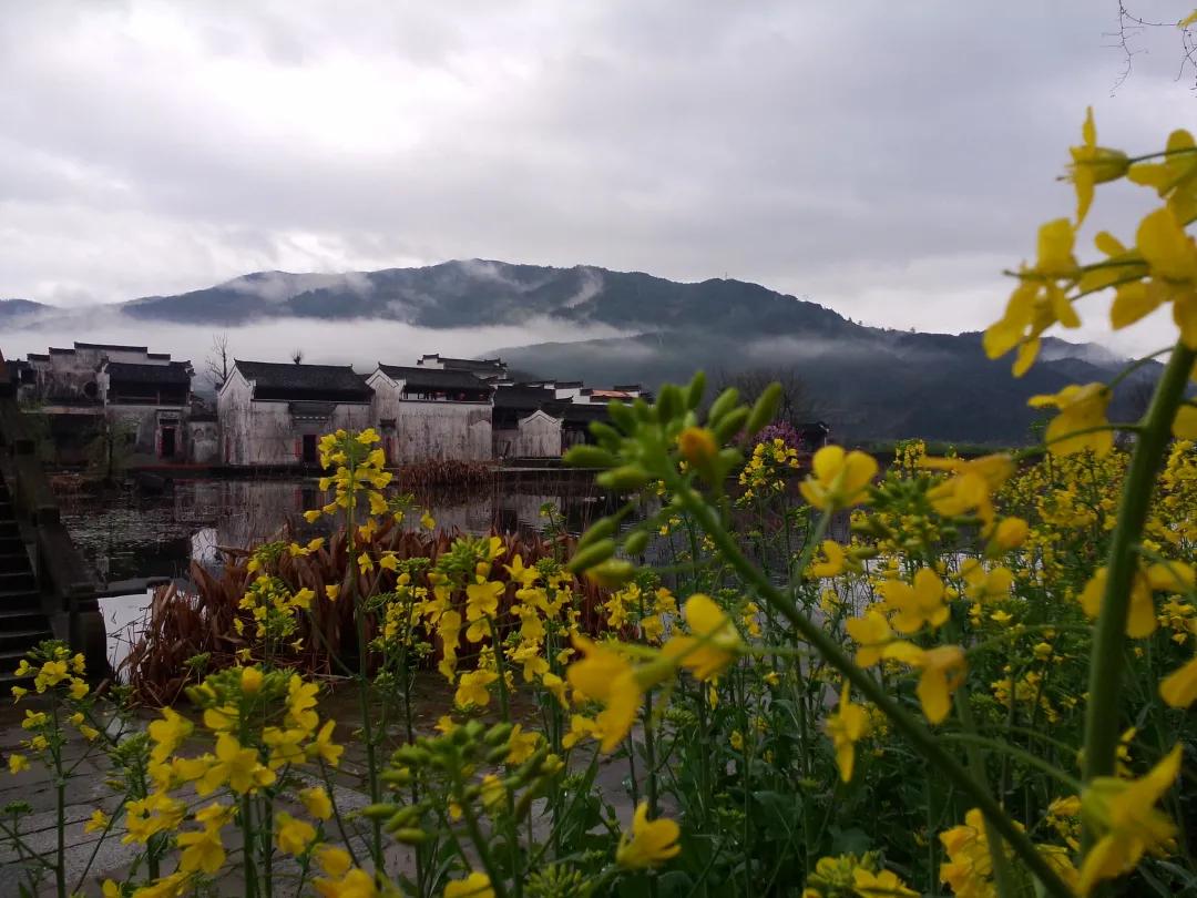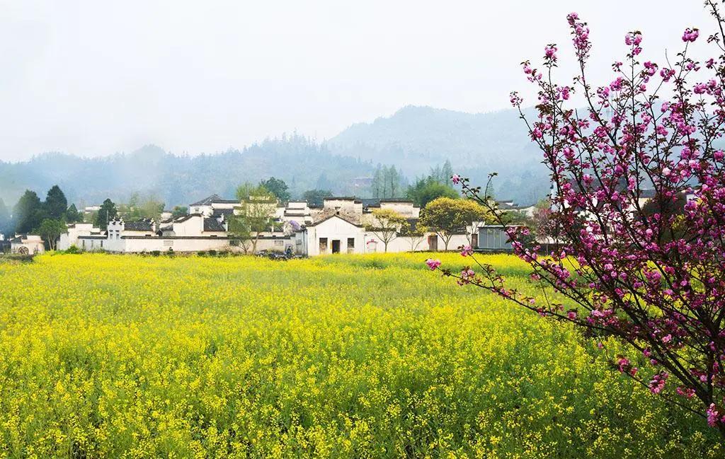 春天來臨時(shí),漫天金黃的油菜花將水墨色的徽派建筑照耀著,白墻青瓦反射著微黃色的光,細(xì)看之下,還有幾枝桃花點(diǎn)綴其中。村里裊裊炊煙一直飄到了青色的山上,與山上的煙霧糾纏在一起。這大概才是徽州真正的模樣。