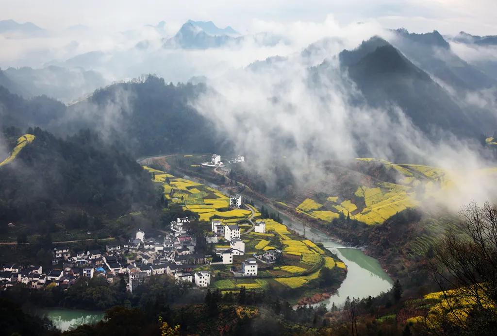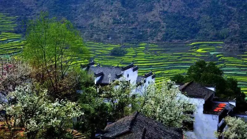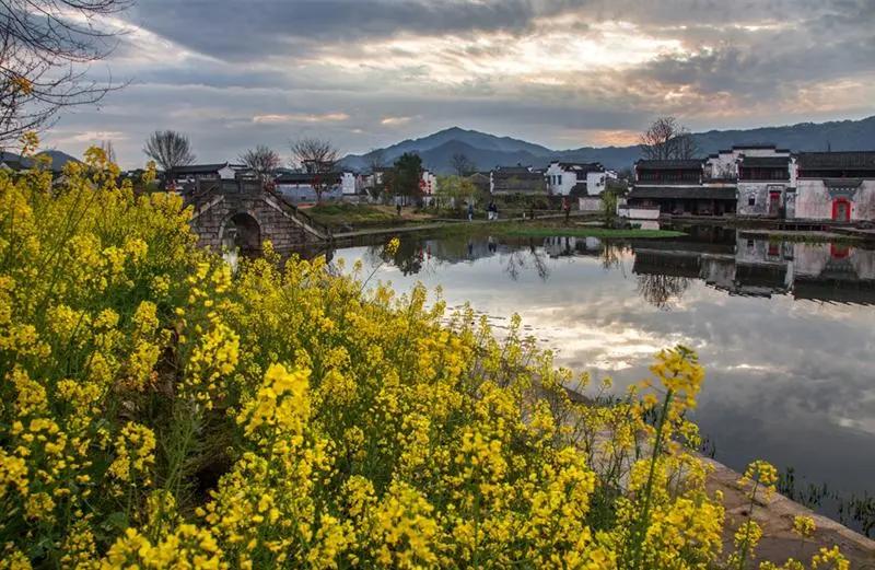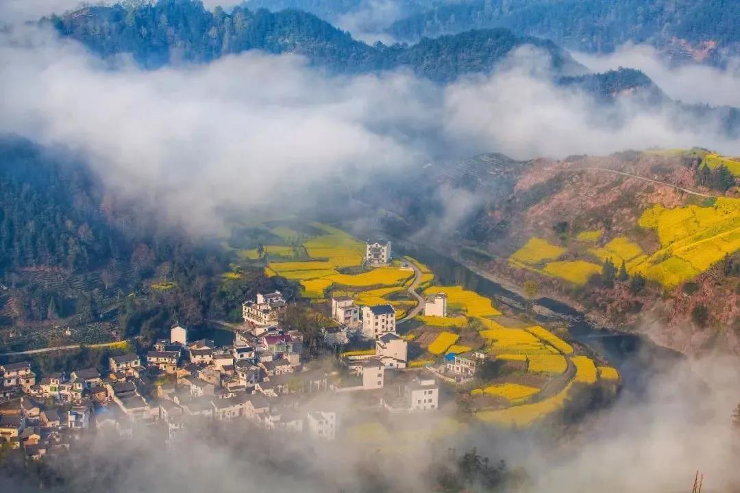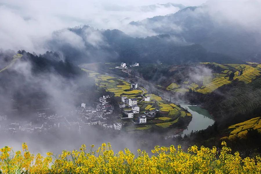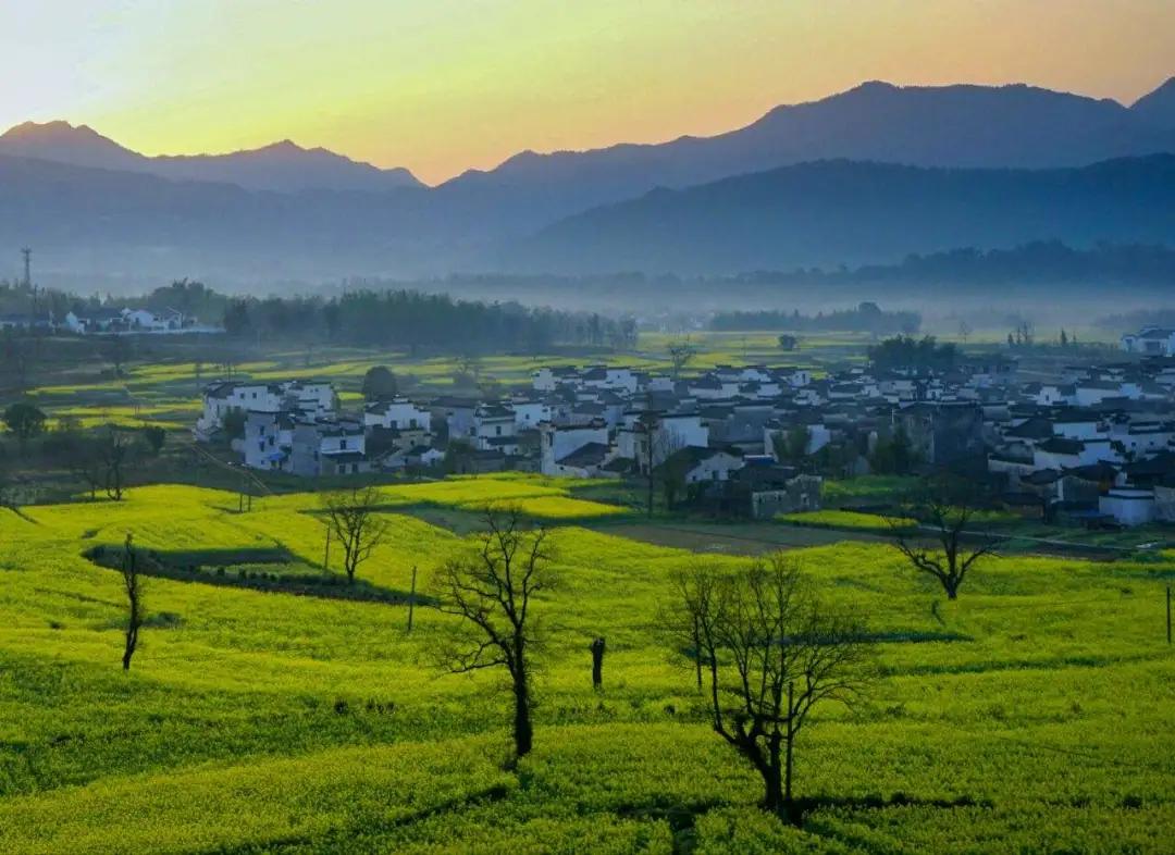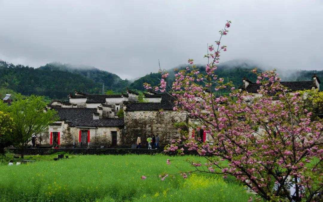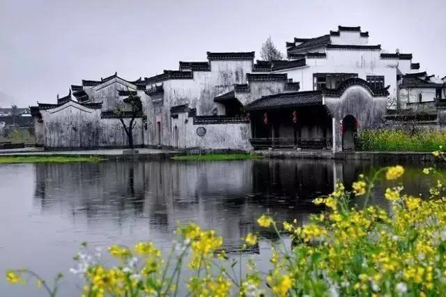 春天來臨時(shí),漫天金黃的油菜花將水墨色的徽派建筑照耀著,白墻青瓦反射著微黃色的光,細(xì)看之下,還有幾枝桃花點(diǎn)綴其中。村里裊裊炊煙一直飄到了青色的山上,與山上的煙霧糾纏在一起。這大概才是徽州真正的模樣。