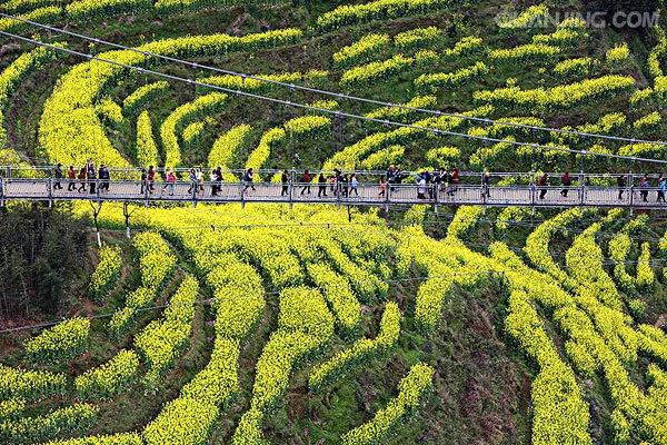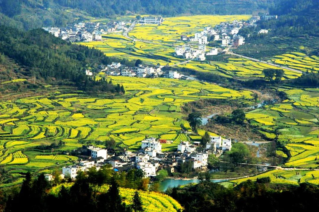 江嶺南臨曉起,東接溪頭,地處婺源縣最東北,是婺源最值得去的地方。站在山頂望去,腳下大片的山谷內(nèi),油菜花層層疊疊,一望無際,中間圍攏著幾個(gè)小小的村落,黑瓦白墻的徽派民居夾雜在一片金黃之間。