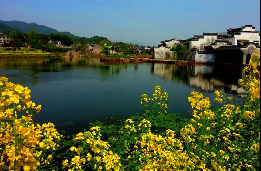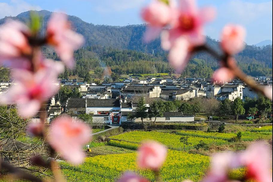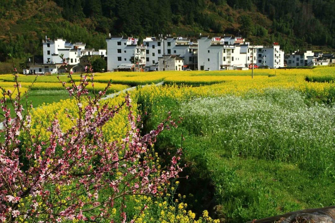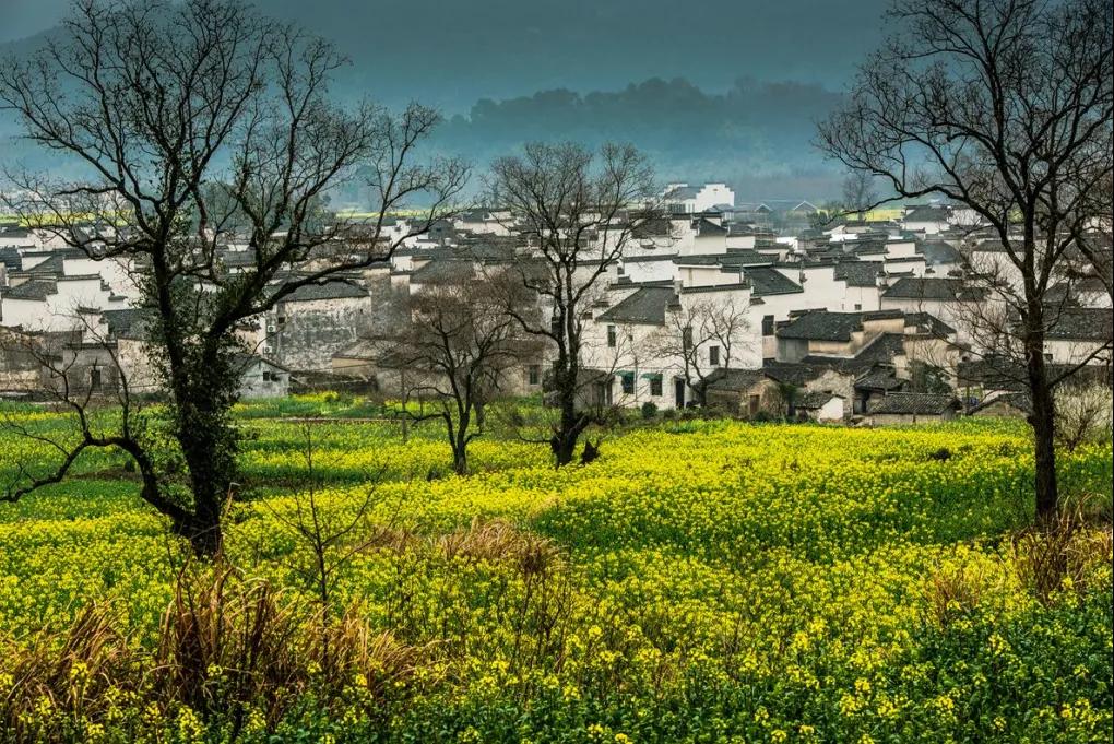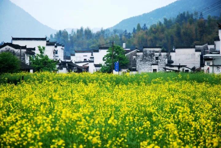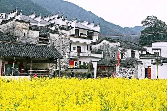粉墻黛瓦的徽州古民居點(diǎn)綴于廣闊的油菜花叢中