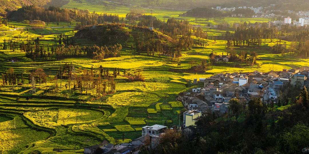那里漫山遍野的油菜花呈梯田狀,從山頂鋪散到山谷下。
