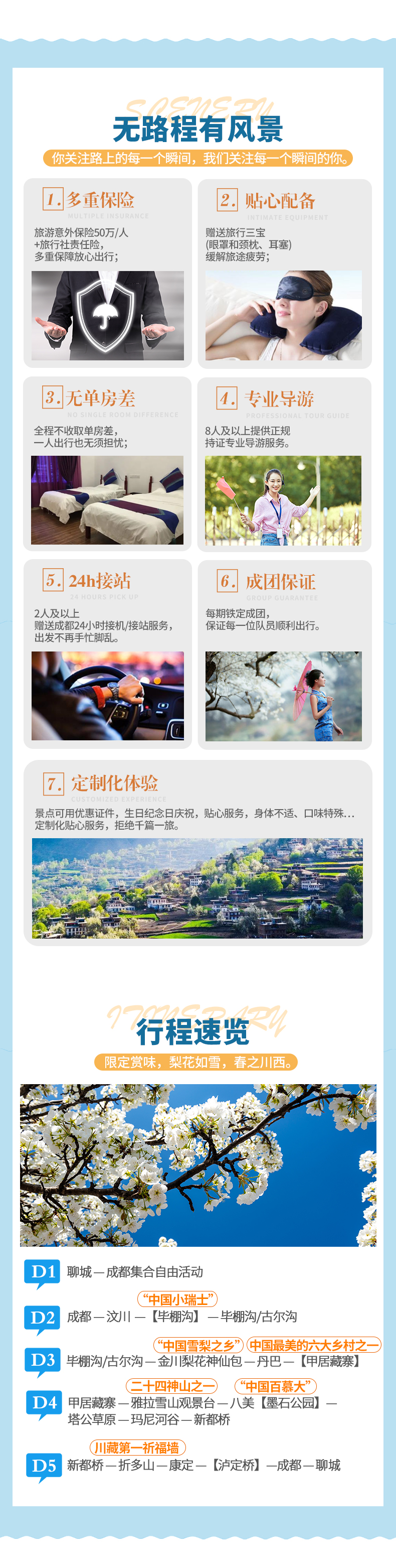 請(qǐng)對(duì)應(yīng)使用「我們」金川梨花節(jié)6日行程,因使用其它行程造成的投訴,責(zé)任自負(fù);請(qǐng)仔細(xì)閱讀以上行程文檔,同意并保證遵守我方安排,以免為您帶來(lái)不必要的麻煩;如產(chǎn)生合同糾紛或人身意外事故,按《中華人民共和國(guó)合同法》、《道路交通法》、《保險(xiǎn)賠償條例》裁定;本行程作為旅游合同附頁(yè)與旅游合同同等法律效力。