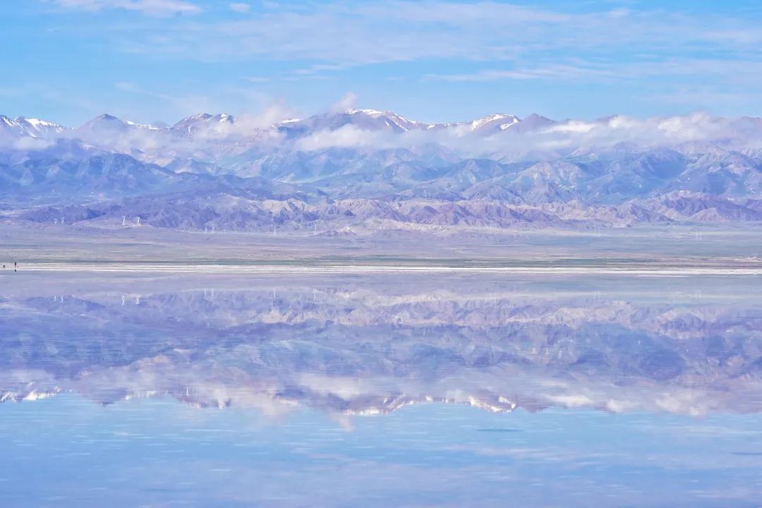 茶卡鹽湖被國家旅游地理雜志評為“人一生必去的55個地方”之一,這里的采鹽歷史非常悠久,湖水含鹽量很大,湖面上會自然結(jié)晶,一片純白。結(jié)晶之上是一層薄薄的露水,將天空、云朵和對岸的山都倒映在白色的湖里,非常漂亮,所以也被稱為“中國的天空之境”。大家可以乘坐景區(qū)內(nèi)的小火車前往景區(qū)深處游玩,如果不乘坐小火車,沿著鐵軌向湖深處散散步拍拍照片也是非常愜意的。