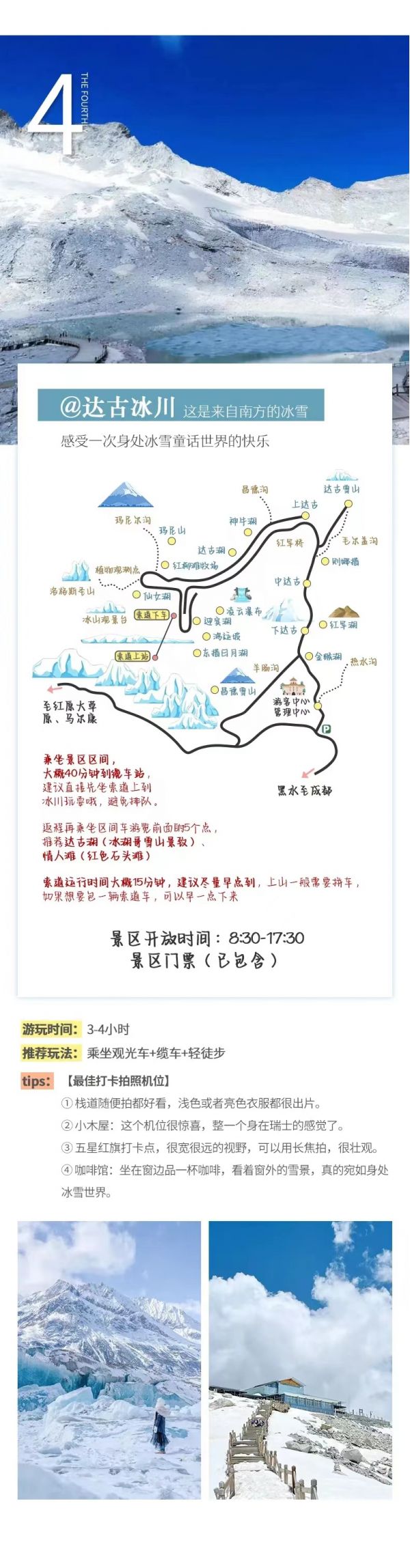 (1)達古冰川景區(qū)山頂海拔達到4860米,可乘坐索道抵達,您可根據(jù)自身身體狀況選擇前往,進景區(qū)后請不要劇烈運動,景區(qū)內(nèi)有大型天然氧吧,如有不適應(yīng)可以進氧吧休息。