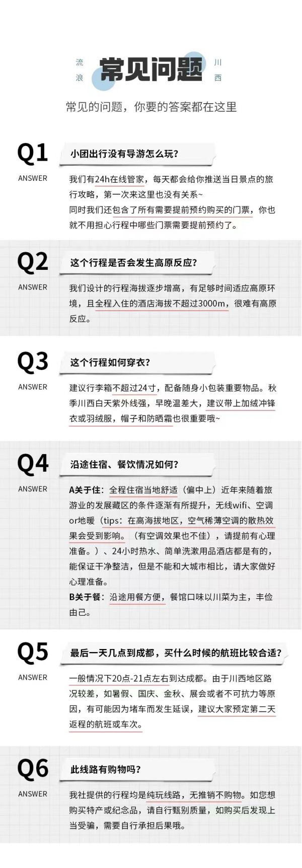 (1)受天氣、堵車等客觀因素影響,當(dāng)日回成都比較晚,請盡量不預(yù)訂當(dāng)天的返程機票或火車票,以免因為堵車給您帶來沒有必要的損失。