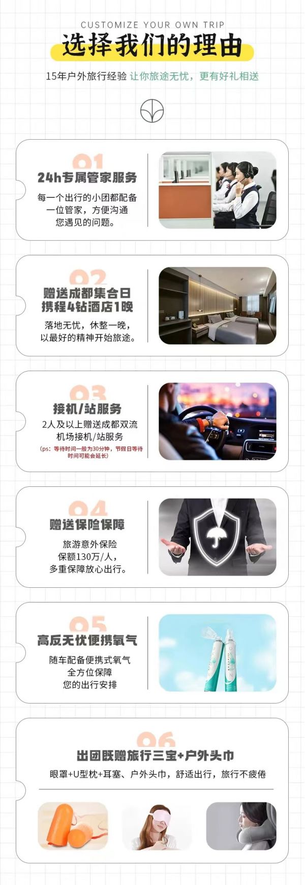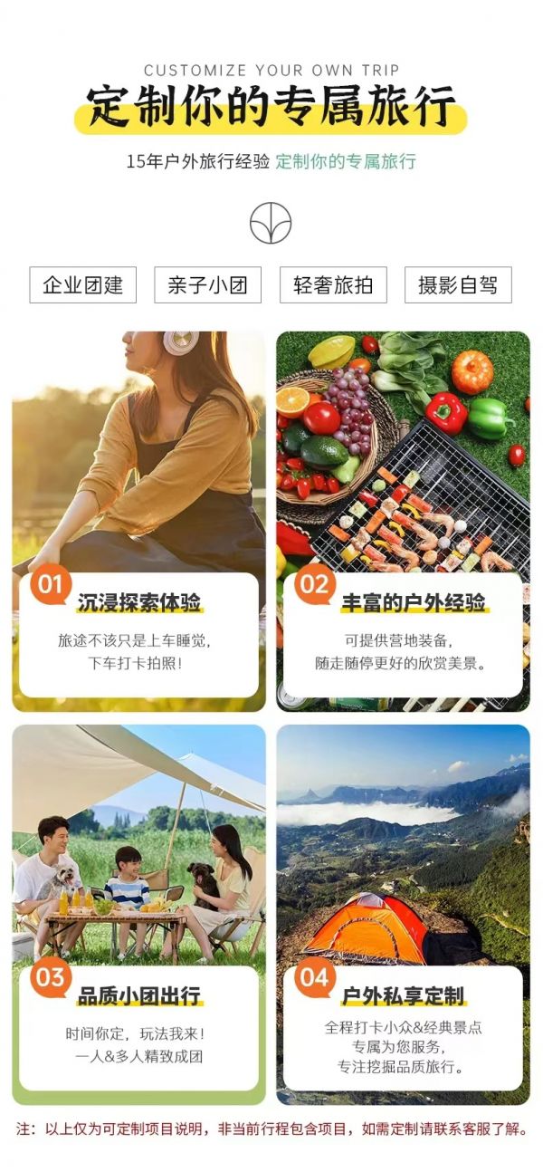 私人訂制:我們業(yè)務(wù)范圍囊括了全國(guó)各大城市,川西、西北、新疆,在路上永遠(yuǎn)有我們的身影。我們將為每一個(gè)有定制需求的你策劃出獨(dú)屬于自己的完美旅行。
