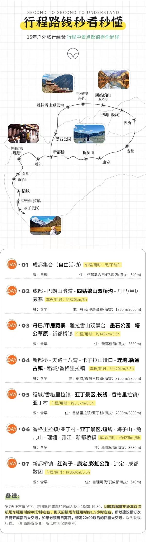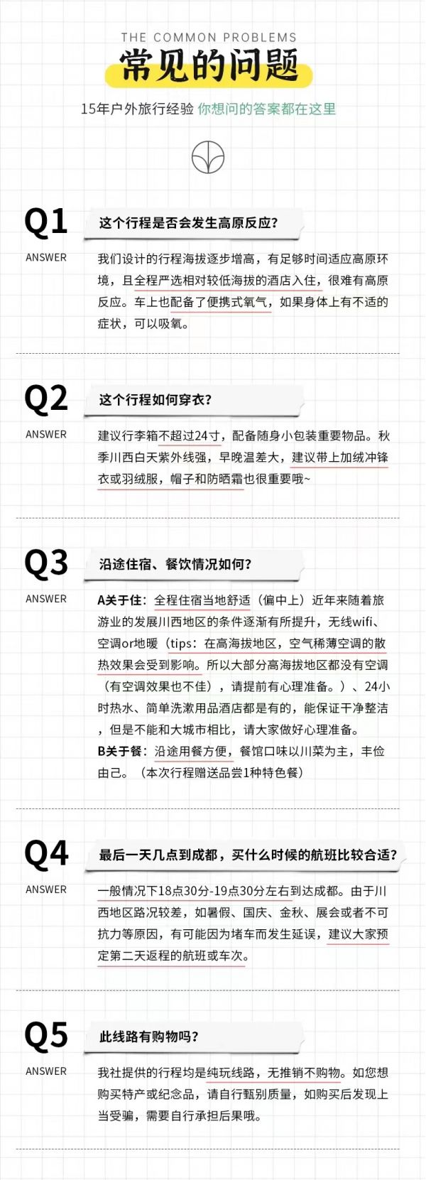 (1)以上行程時(shí)間安排可能會(huì)因天氣、路況等原因做相應(yīng)調(diào)整,正常情況下完團(tuán)回到成都時(shí)間為晚上18:30至19:30左右,如果必須當(dāng)日離開(kāi),請(qǐng)定22:00以后的回程大交通,以免耽誤行程,敬請(qǐng)諒解;
