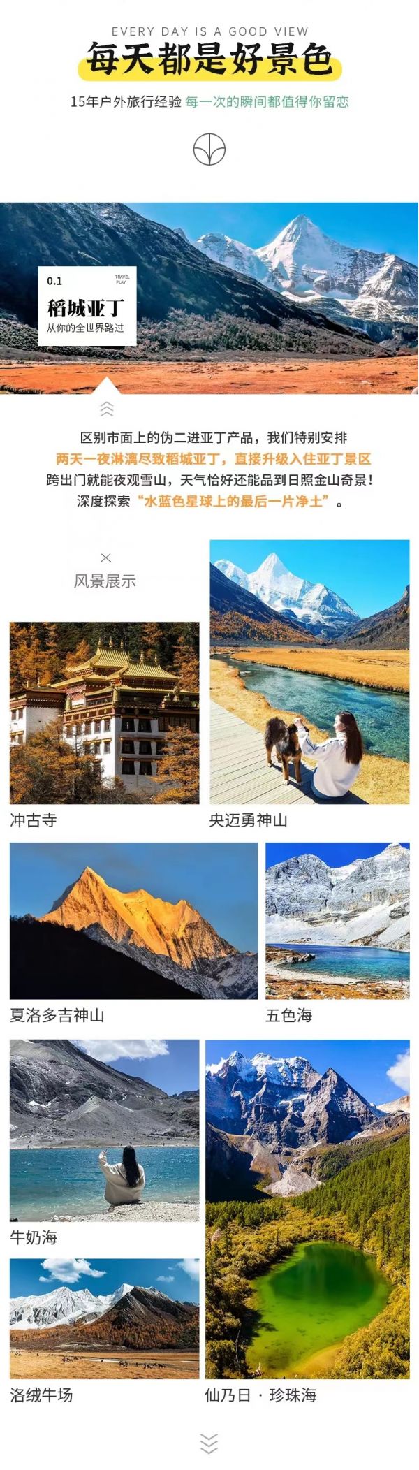 身體狀況好的朋友可以試著挑戰(zhàn)徒步神山線路,從洛絨牛場(chǎng)徒步前往【牛奶?!浚▎纬?公里),后繼續(xù)徒步300米至【五色?!?,海拔較高,天氣變化比較大,徒步往返大概需要5—6個(gè)小時(shí);或者是在洛絨牛場(chǎng)先騎馬3公里至舍身崖(費(fèi)用300元/人自理),后繼續(xù)徒步至牛奶海、五色海,往返約4~5小時(shí);到達(dá)目的地飽覽海子美景后,大家原路返回,徒步神山對(duì)身體素質(zhì)要求比較高,無(wú)論選擇哪種方式,請(qǐng)大家一定量力而行。