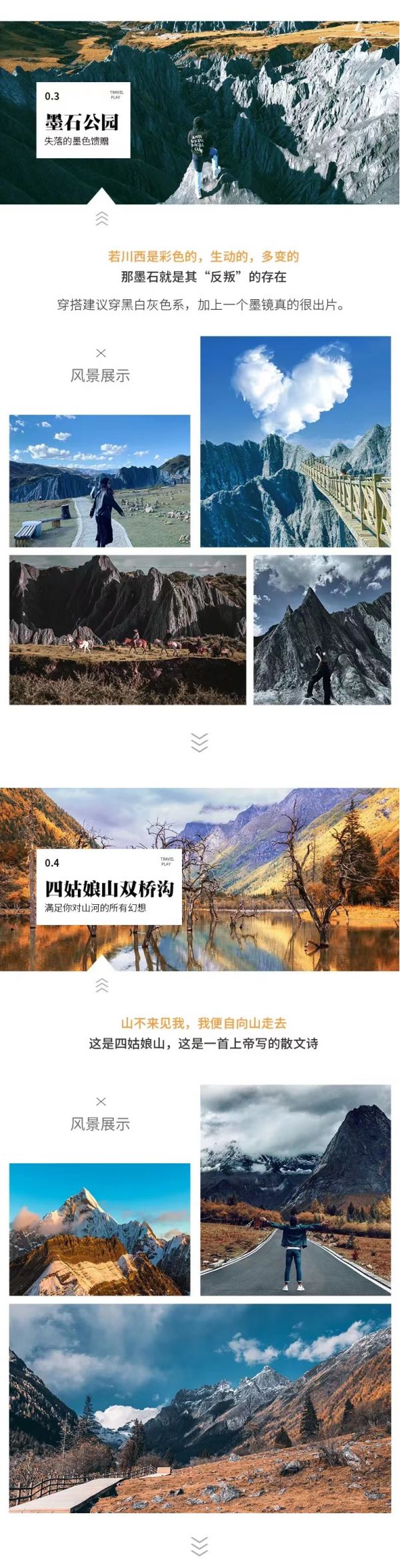 住宿:丹巴縣酒店或甲居藏寨民宿標(biāo)間說(shuō)明”早餐后酒店集合出發(fā),沿岷江而上,沿途經(jīng)都江堰、紫坪埔水利工程,沿都汶高速抵映秀,沿途感受2008年汶川大地震“地動(dòng)山搖、山崩地裂、滄海桑田”后的景象,感悟大自然的力量;觀看震后統(tǒng)一重建的具有民族特色的民居,感受人定勝天的威力。而后從映秀出抵耿達(dá)鄉(xiāng)沿臥龍峽谷,欣賞峽谷小橋、流水、枯藤、老樹(shù)的美麗風(fēng)光,而后經(jīng)巴郎山可觀映山紅、紅白杜鵑花、松蘿、高山草甸等;觀看植物從常綠闊葉林到高山荒漠的垂直變化,感受“一山觀四季、十里不同天”的氣象變遷。中午抵達(dá)四姑娘山。午餐后游玩雙橋溝,景區(qū)開(kāi)闊平坦、景點(diǎn)集中,全程通車。雖已開(kāi)發(fā),但環(huán)境維護(hù)的出于意料的好,景區(qū)內(nèi)各種服務(wù)包括指示也十分清晰明了,游客們可以更加舒適、方便的游覽整個(gè)景區(qū)。由于整條溝海拔落差達(dá)到一千多米,所以地貌比較豐富,風(fēng)景也完全值得期待。給人遠(yuǎn)離塵世的感悟。游玩盡興后出溝前往丹巴或小金入住酒店休息。