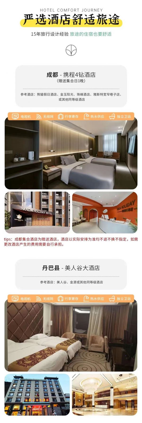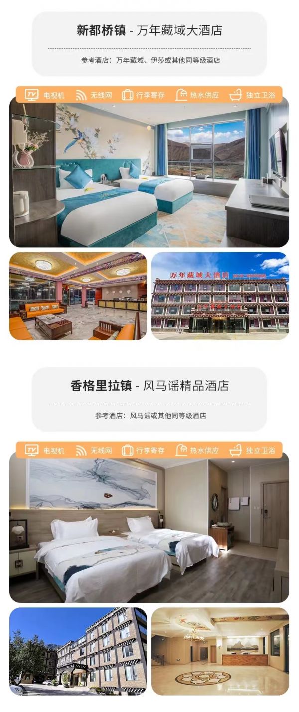 住宿:含全程6晚舒適酒店。(tips:成都集合酒店為贈(zèng)送酒店,酒店以實(shí)際安排為準(zhǔn)均不換不退不指定,如要更改酒店產(chǎn)生的費(fèi)用需要自行承擔(dān)。)